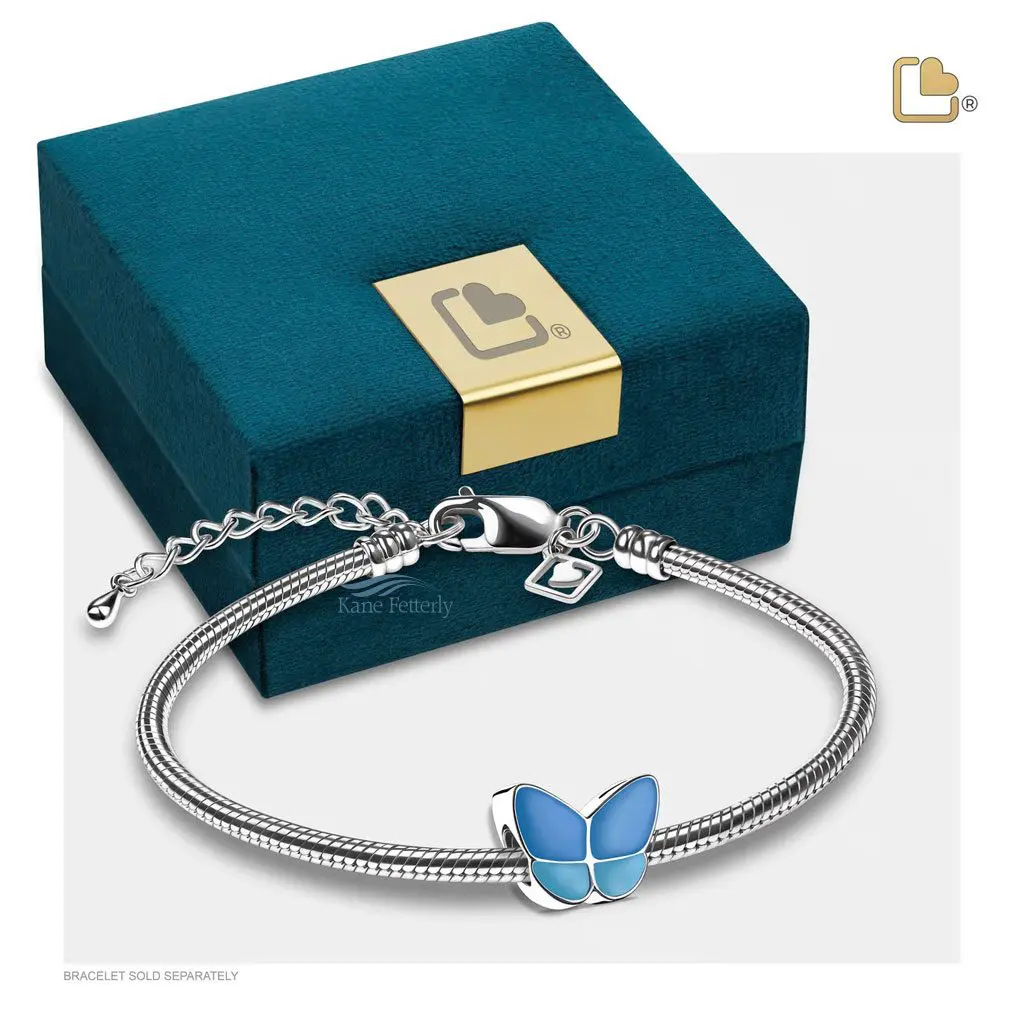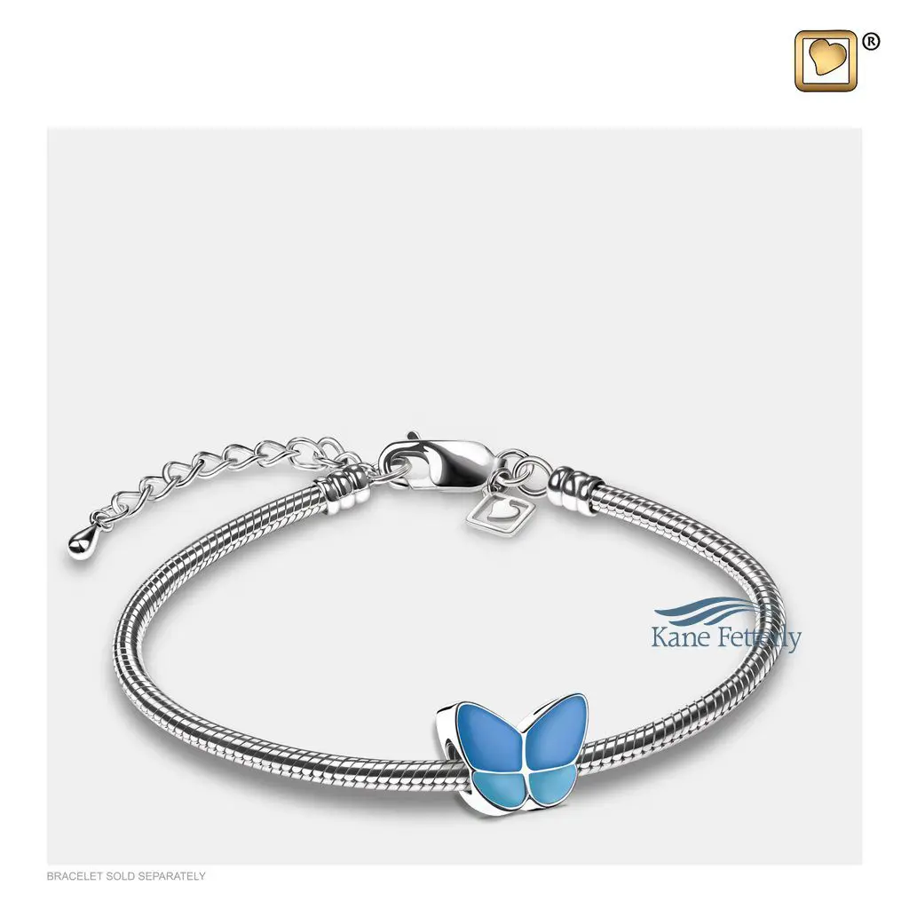 Butterfly bead for ashes, two-tone blue enamel finish. Hand-crafted in rhodium-plated .925 sterling silver.