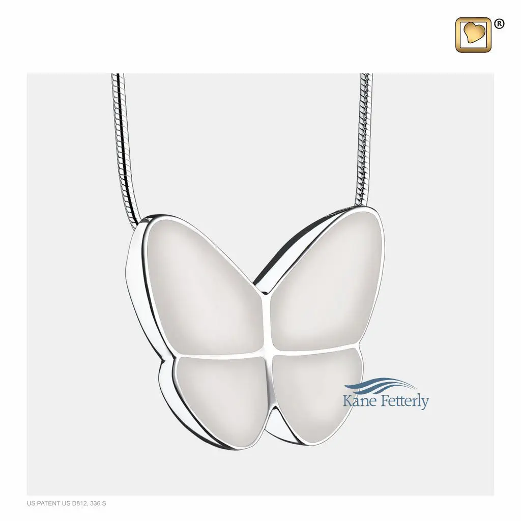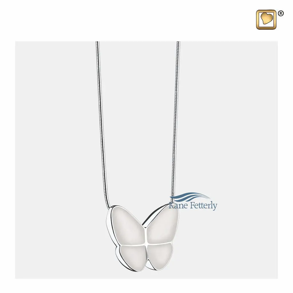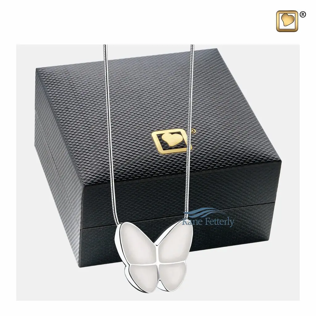 Butterfly pendant for ashes, pearl enamel finish. Hand-crafted in rhodium-plated .925 sterling silver.