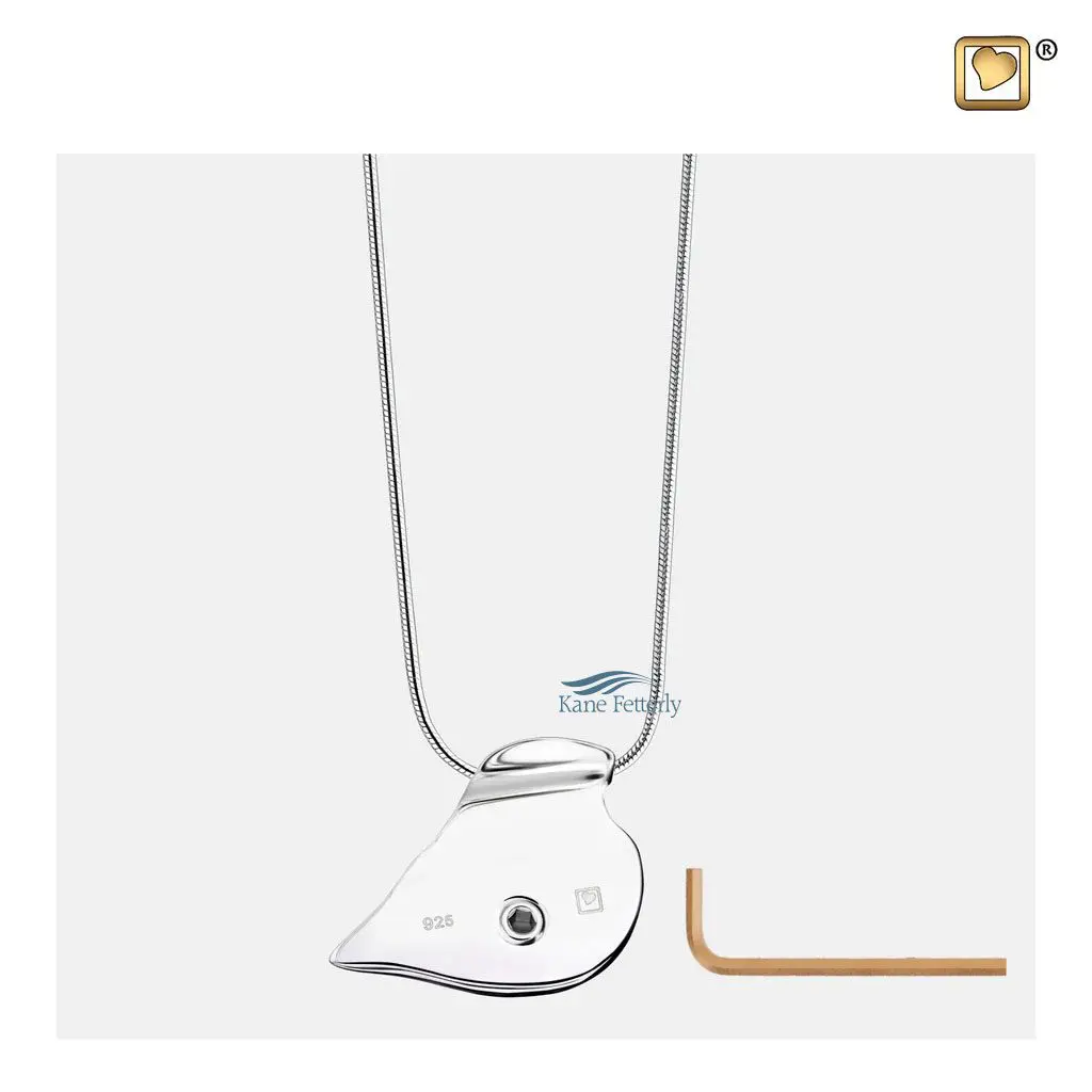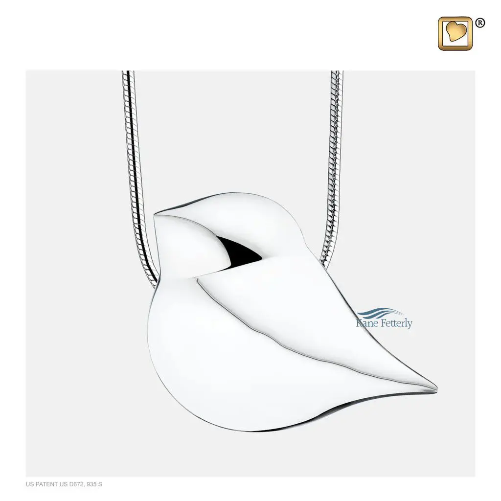 Bird pendant for ashes, polished silver finish. Hand-crafted in rhodium-plated .925 sterling silver.