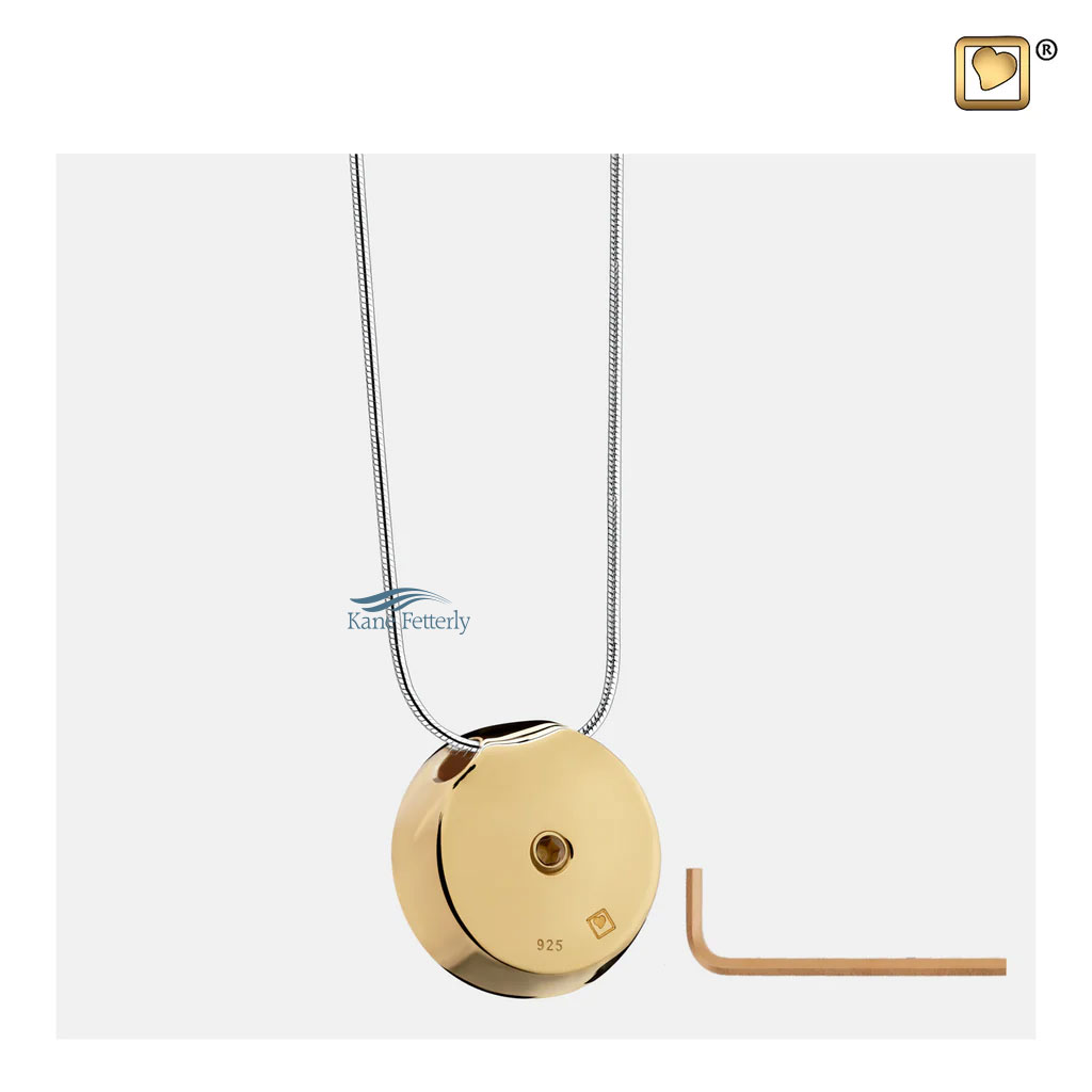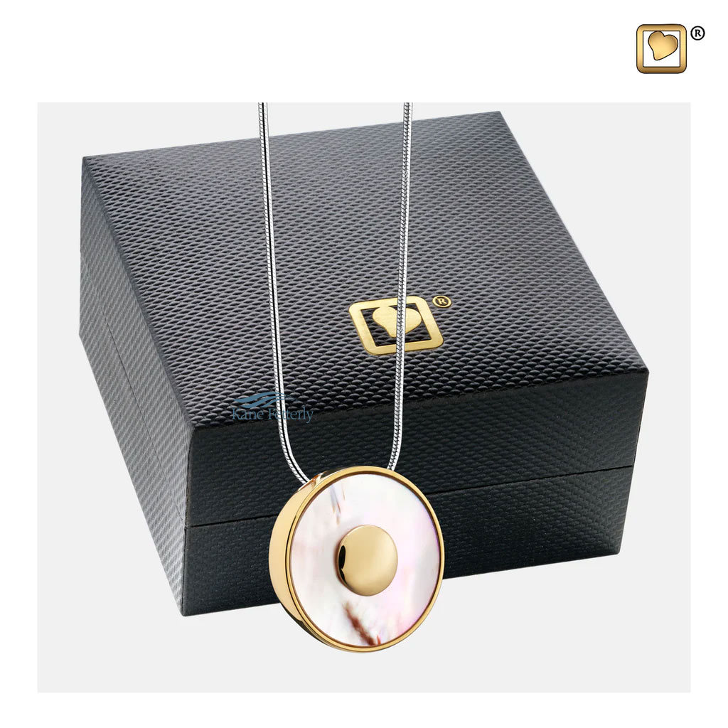 Round pendant for ashes with mother-of-pearl insert and polished gold vermeil finish. Hand-crafted in rhodium-plated .925 sterling silver.