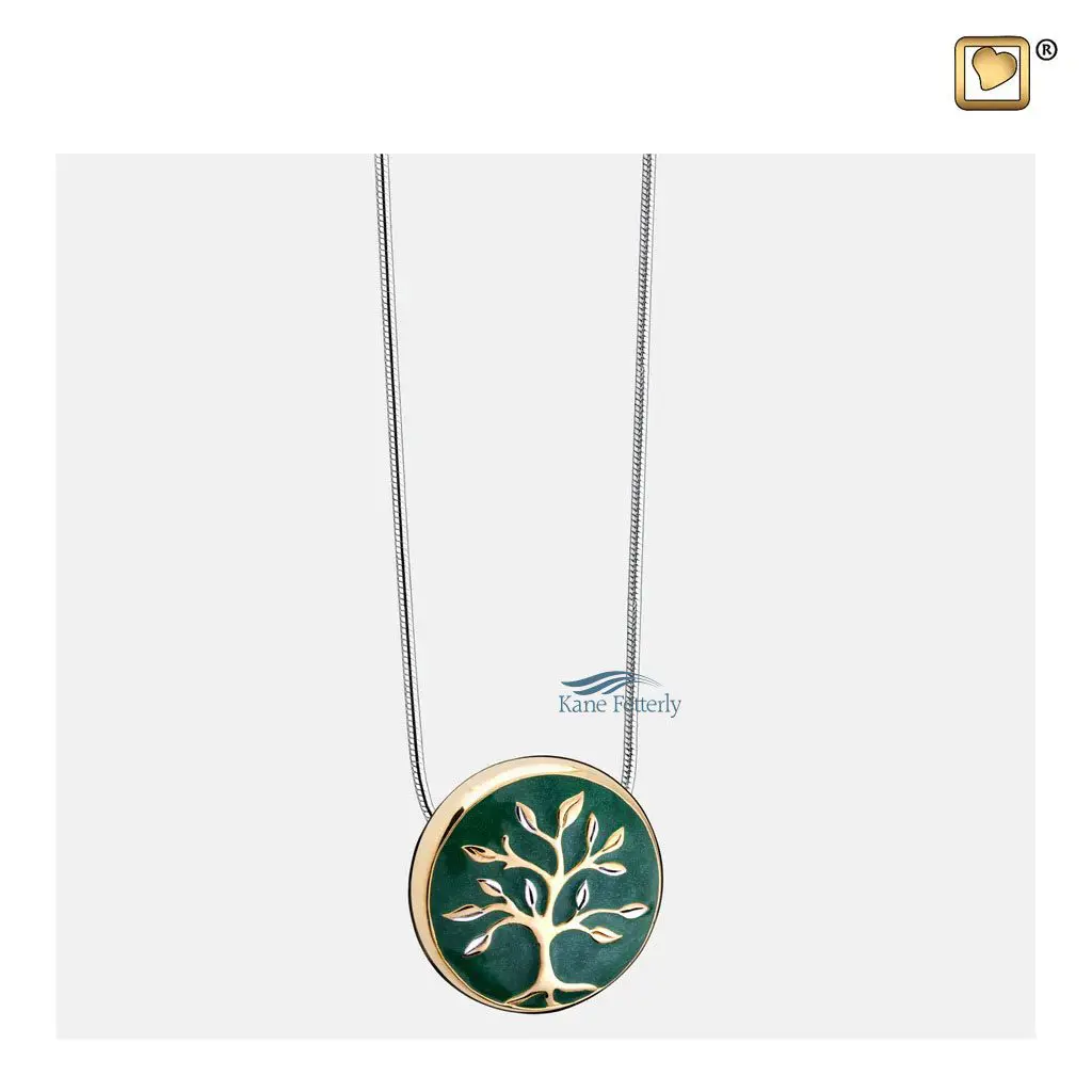 Tree of Life pendant for ashes, green enamel and polished gold vermeil. Hand-crafted in rhodium-plated .925 sterling silver.