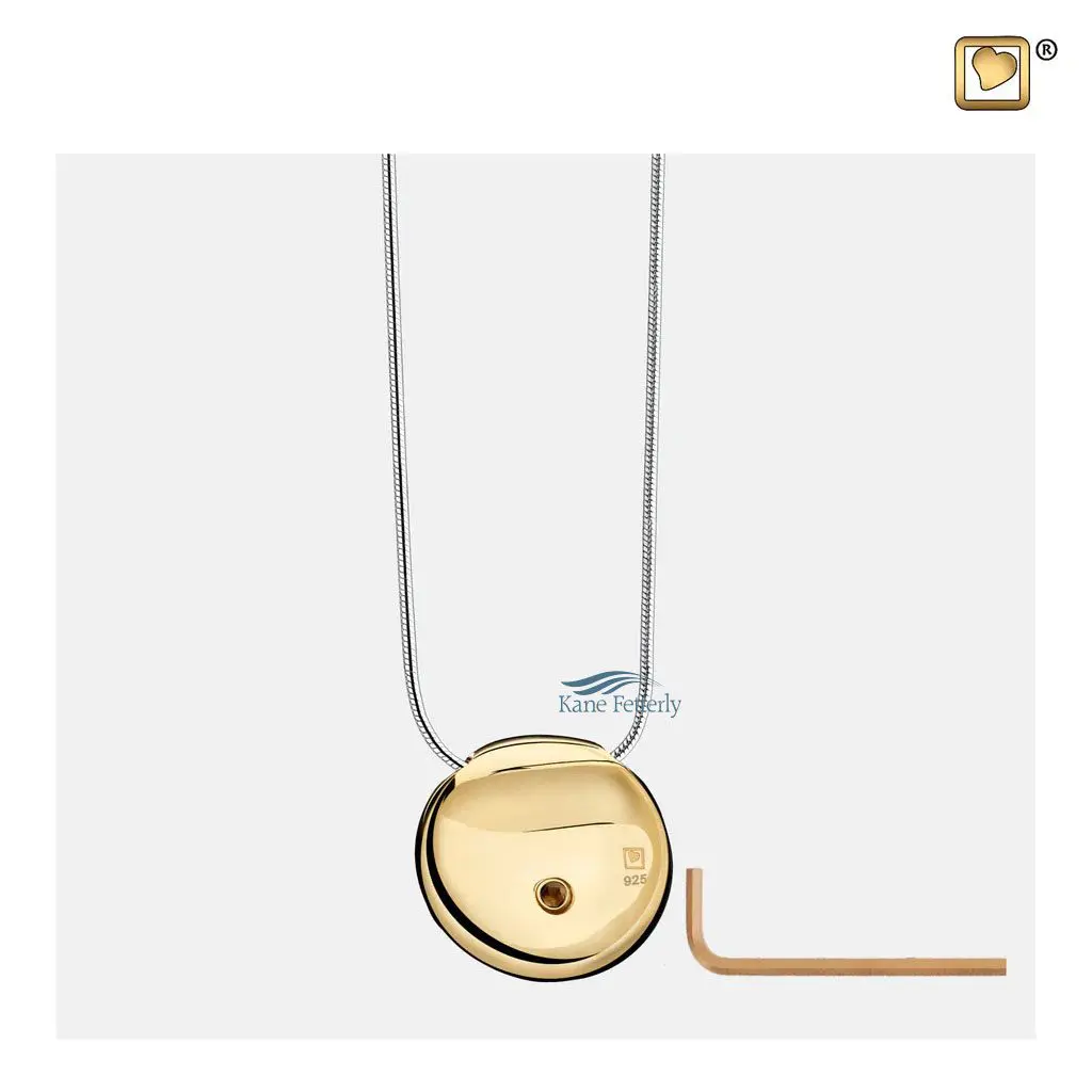 The back of the pendant features a small compartment designed to hold a token of cremated remains.