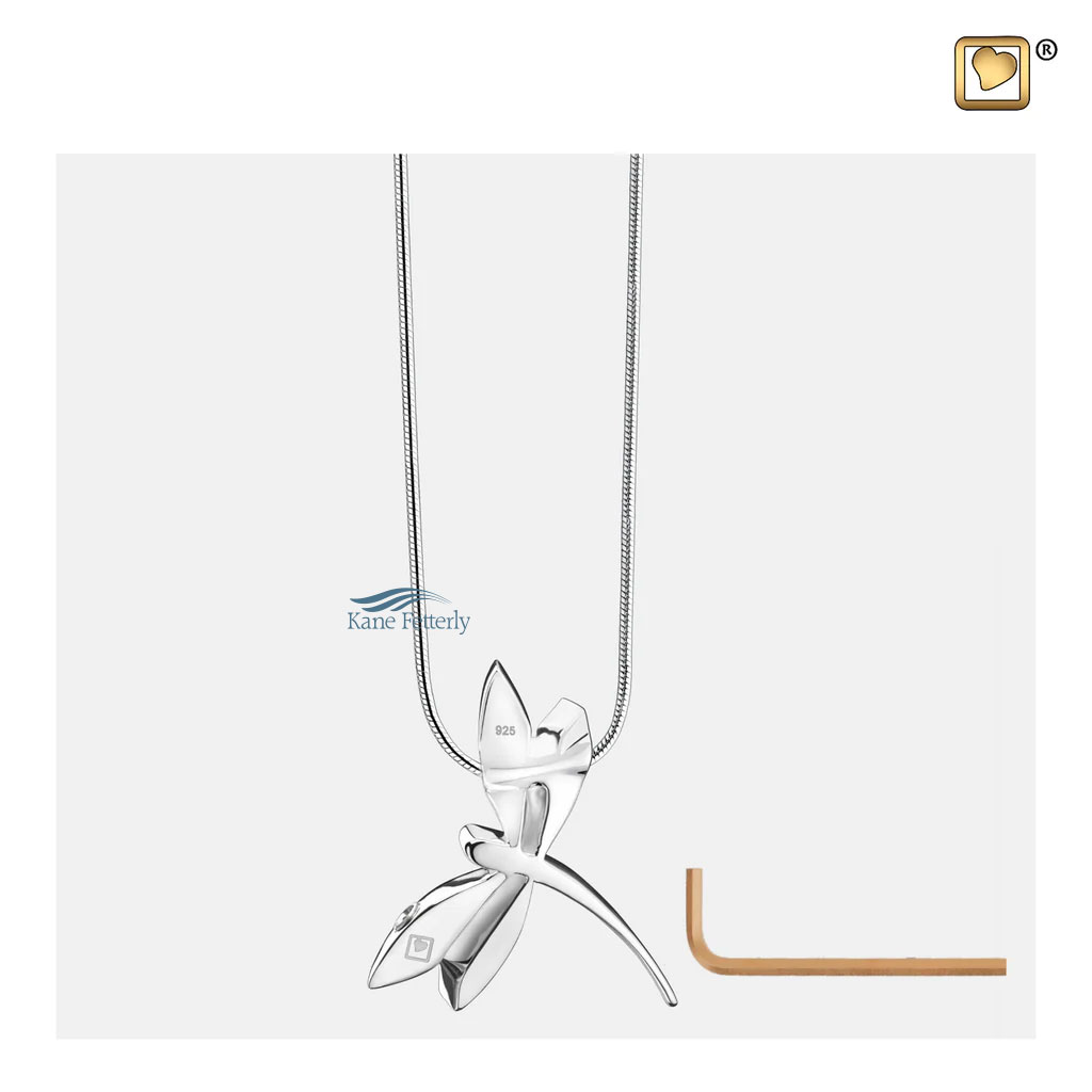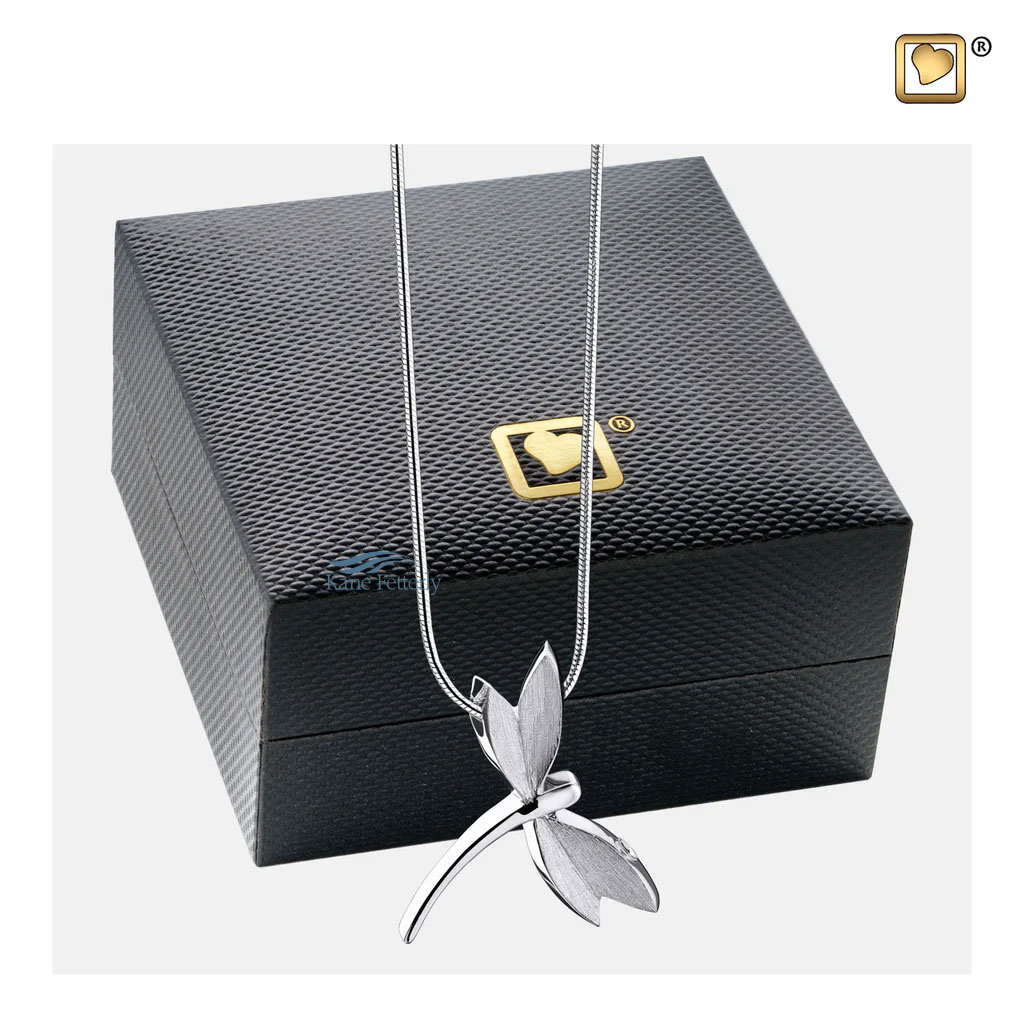 Dragonfly pendant for ashes, polished and brushed silver finish. Hand-crafted in rhodium-plated .925 sterling silver.