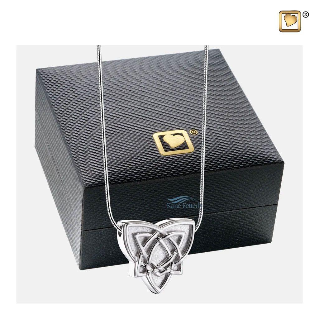 Celtic Trinity knot pendant for ashes, brushed and polished silver finish. Hand-crafted in rhodium-plated .925 sterling silver.