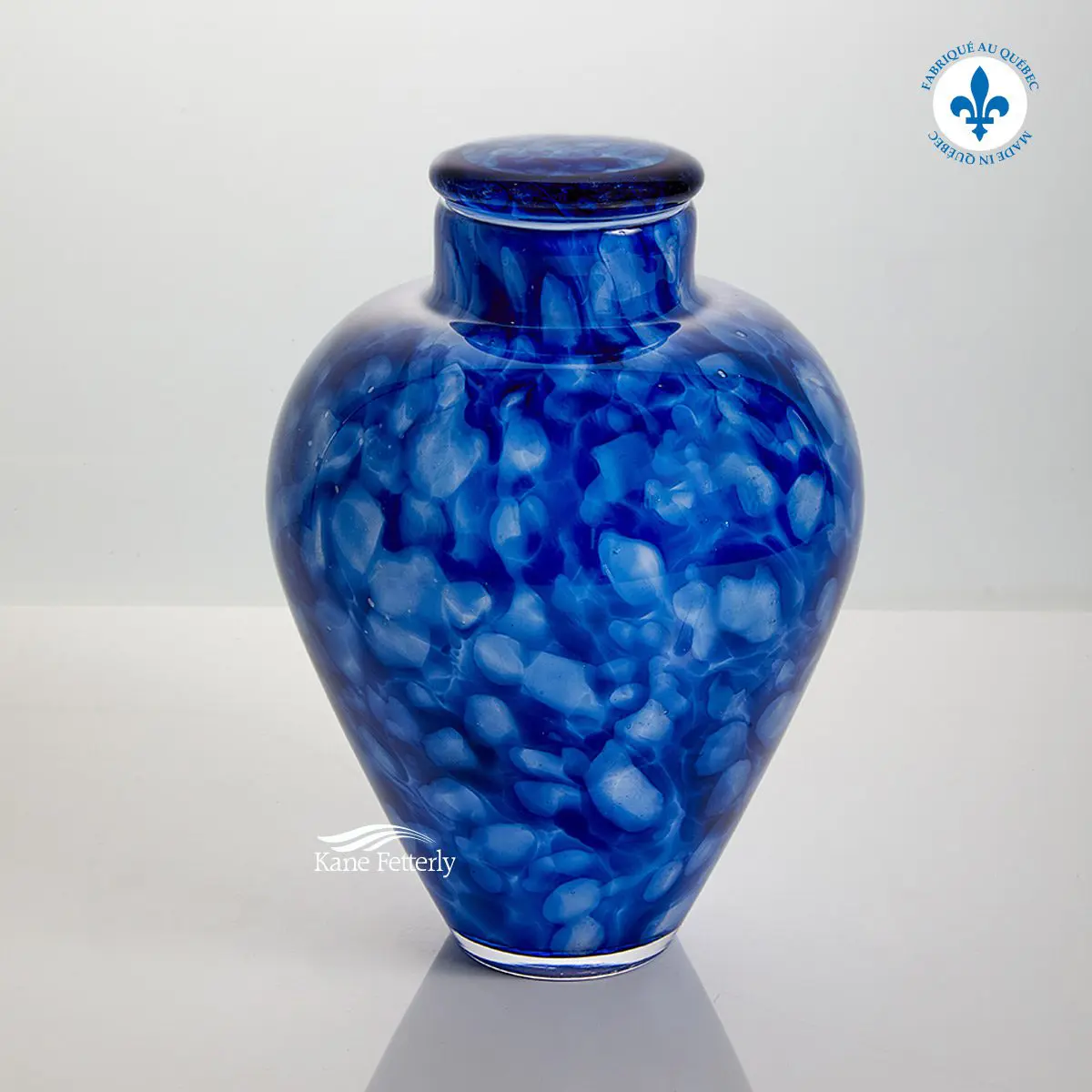 Blue hand-blown glass urn. Urn made in Quebec by local artist. Each model is hand-made, each piece is unique.