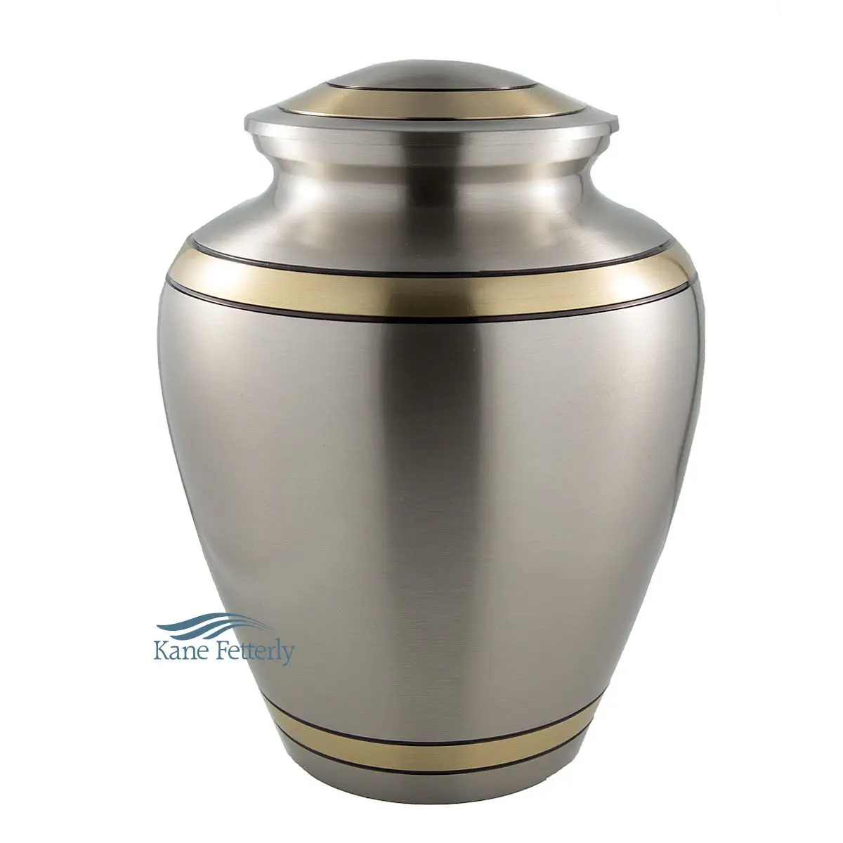Gold brass urn with silver and black bands around the base, the body and the lid.