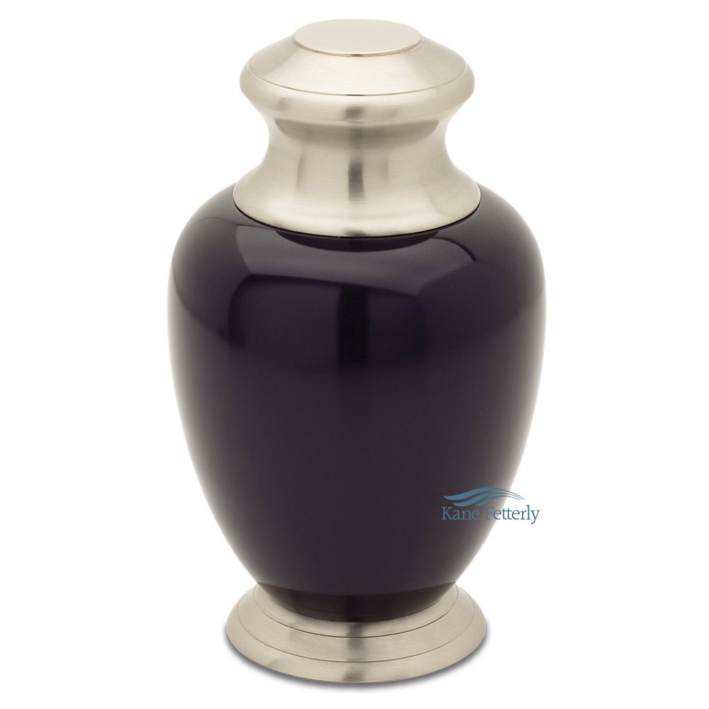 Metal alloy urn with a glossy plum finish and brushed silver accents.