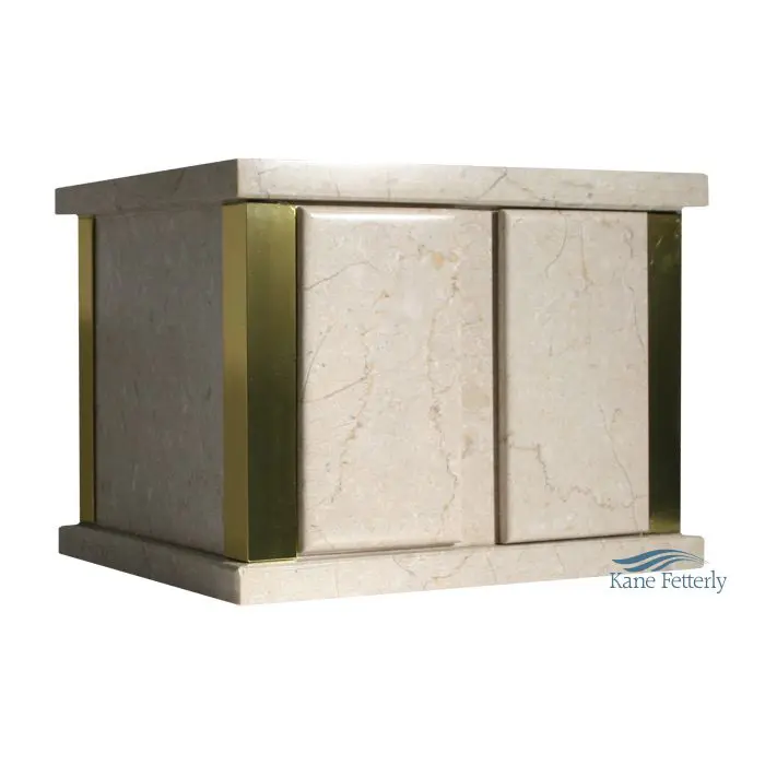 Beige natural marble double urn with gold trims. For information about the personalization options, please contact us at (514) 481-5301