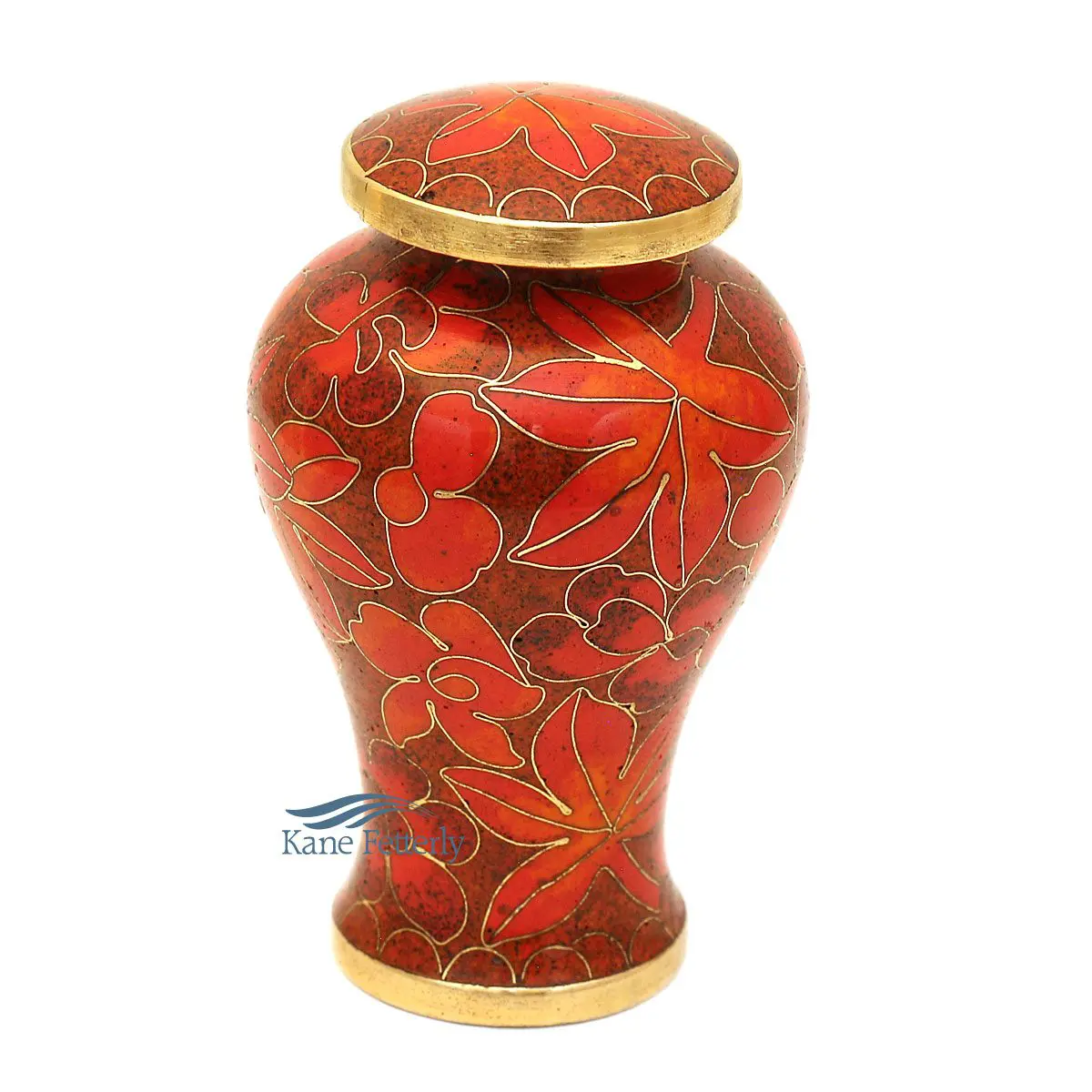 Cloisonné miniature keepsake urn featuring orange and red enamel foliage pattern enhanced by gold bands around the lid and the base.
