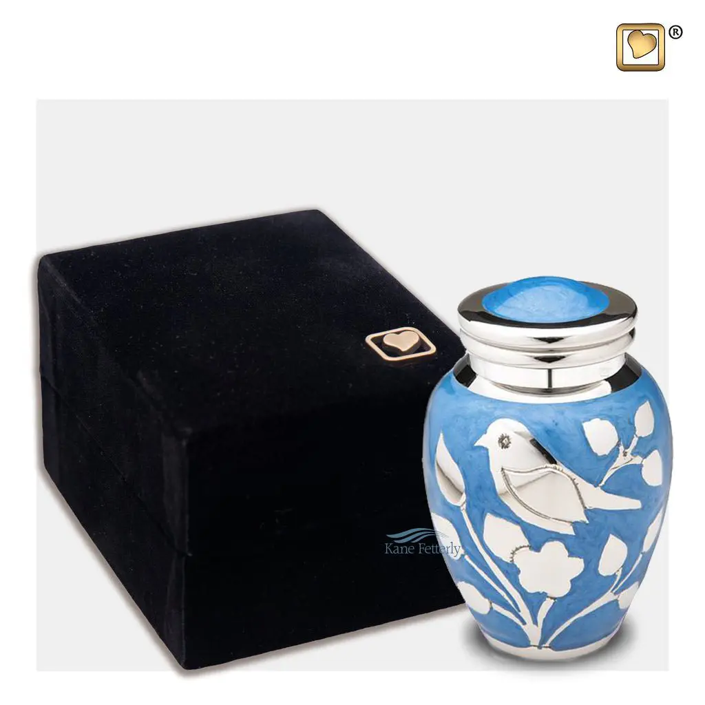 Brass miniature urn with bird and foliage motifs on a blue enamel surface with polished silver accents.