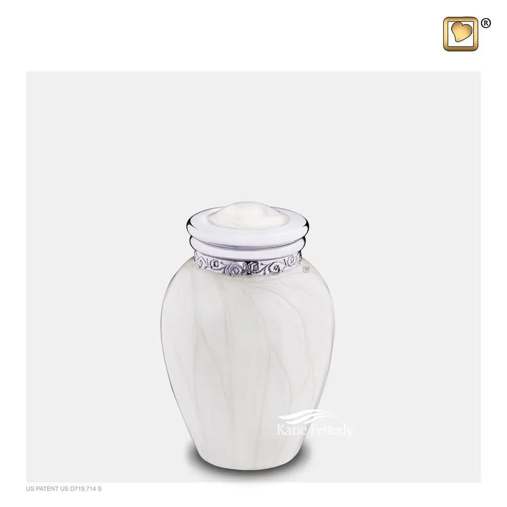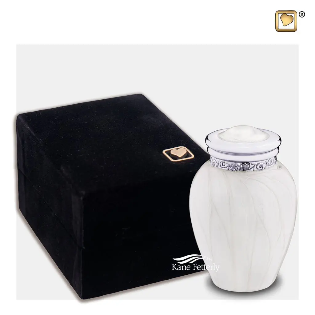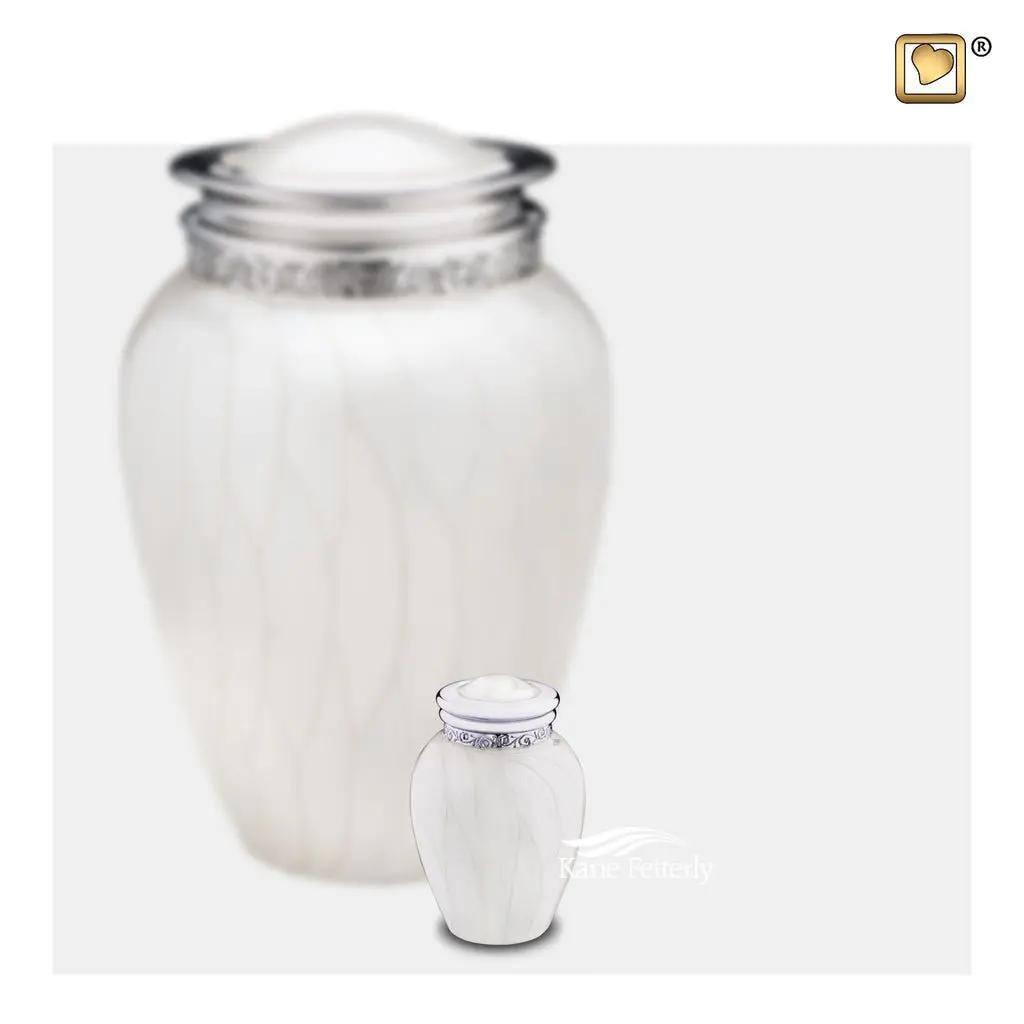 Brass and alloy miniature urn with a lustrous white pearl finish, accented by polished silver and a band with a delicate leaf design.