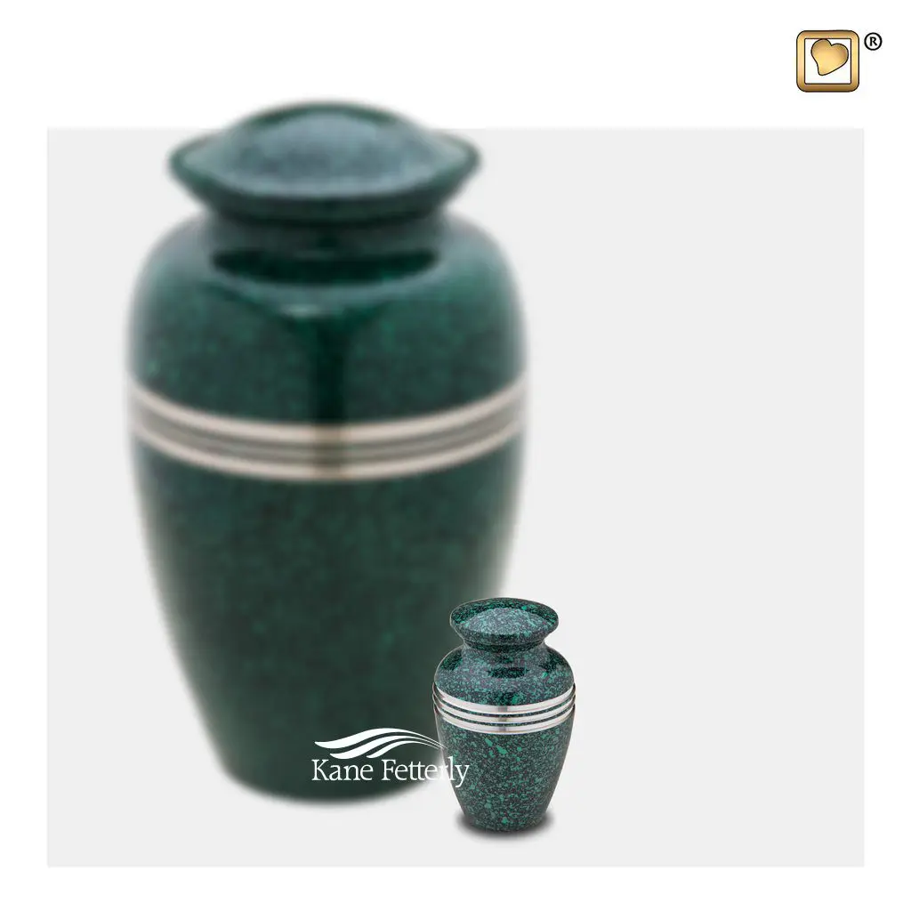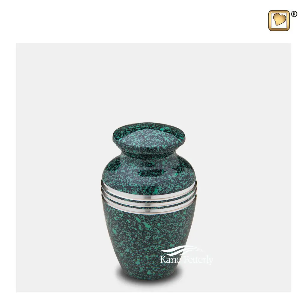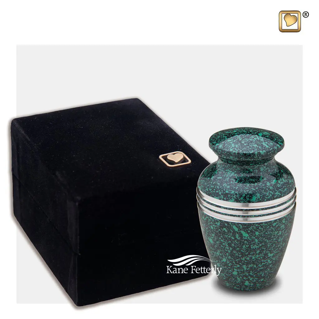 Metal miniature urn with a speckled emerald green finish and brushed pewter accents.