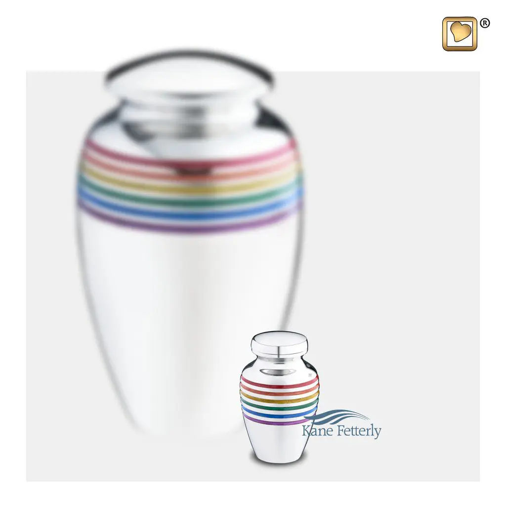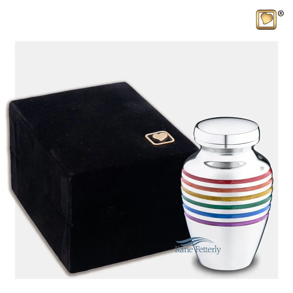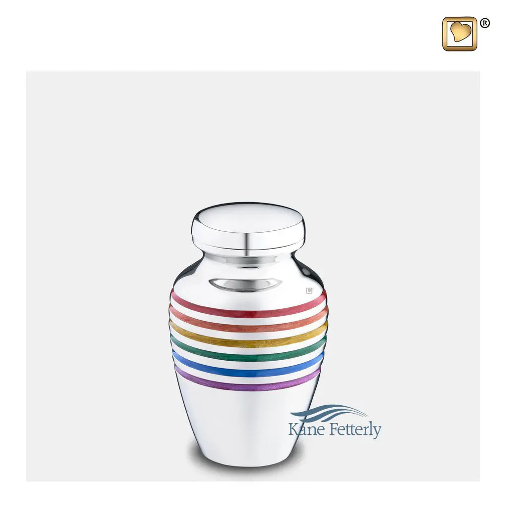 Brass miniature urn with a mirror-polished silver finish and enamel colours representing the pride rainbow.