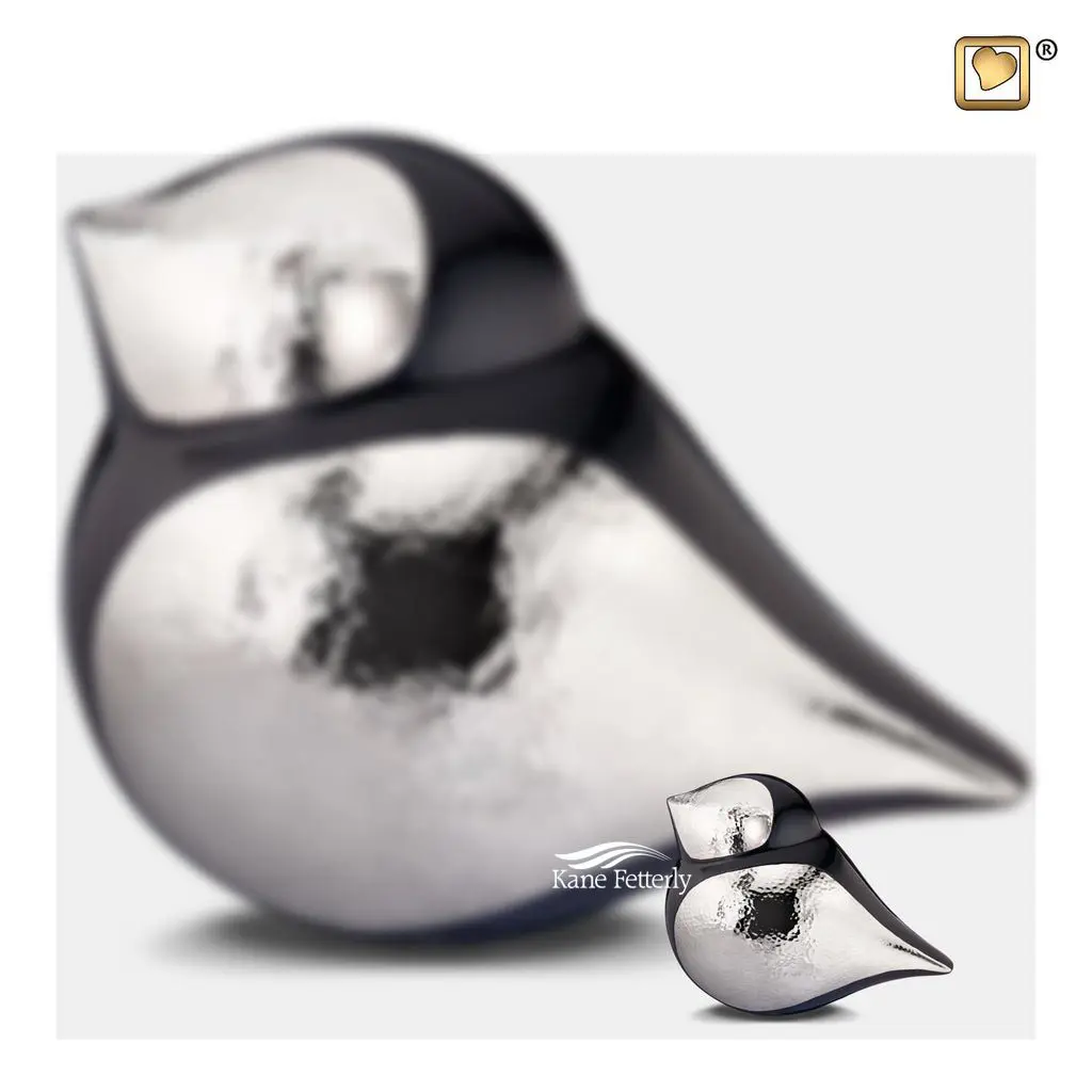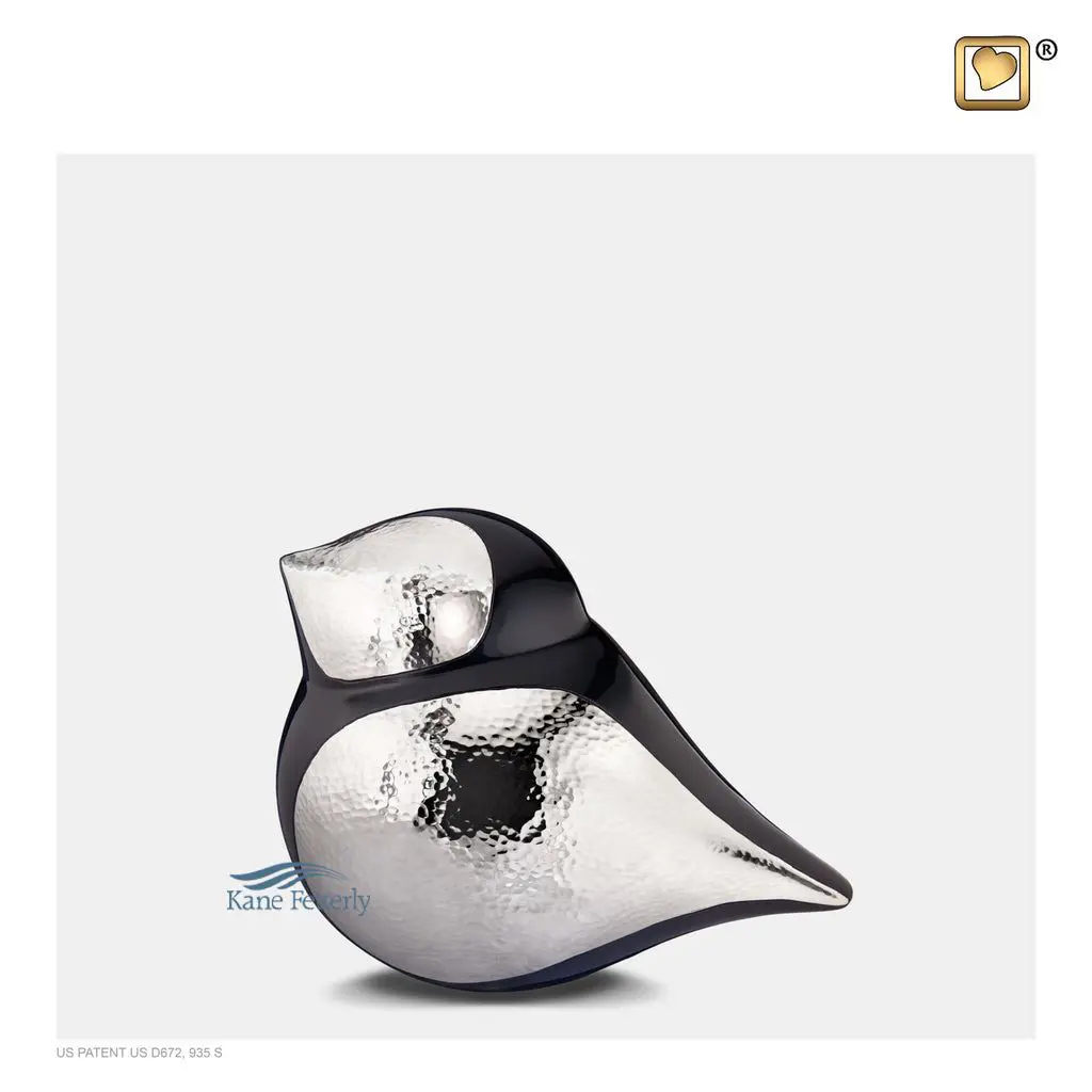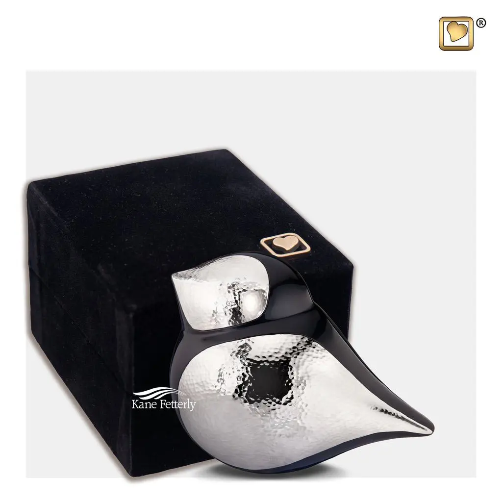 Bird-shaped brass miniature urn with a two-tone matt black and hand-hammered silver finish.