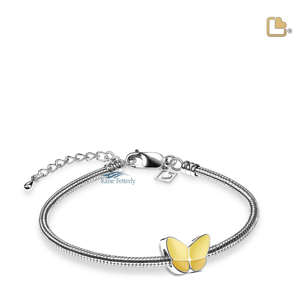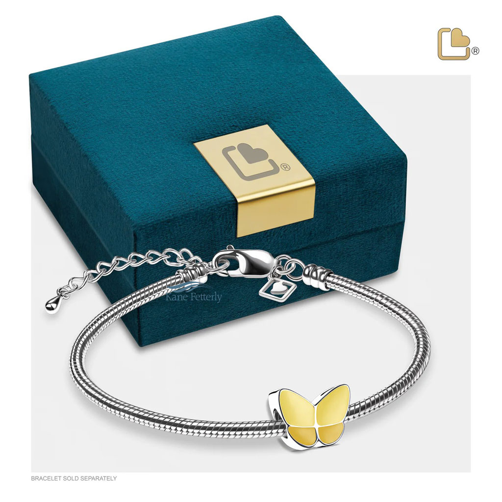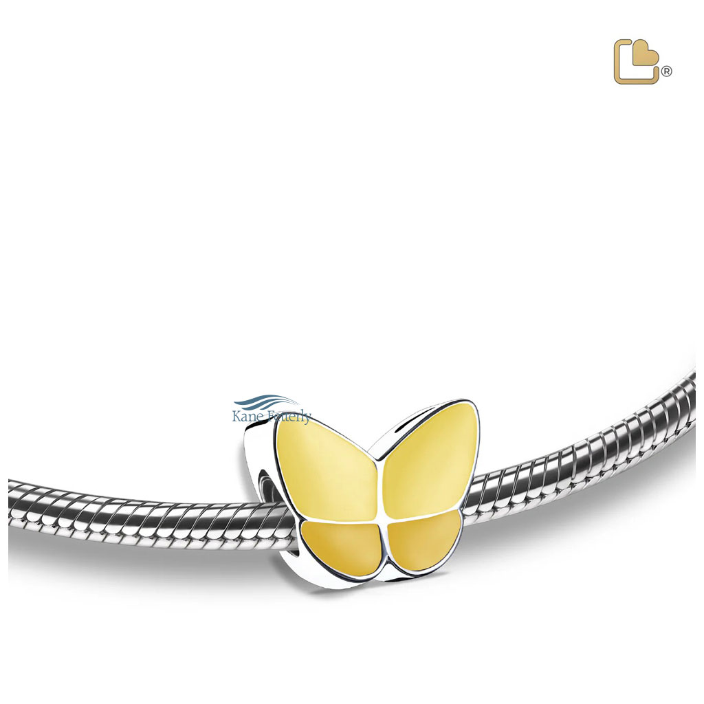 Breloque papillon pour cendres, finition en émail jaune bicolore. Fabriqué à la main en argent sterling .925 plaqué de rhodium.