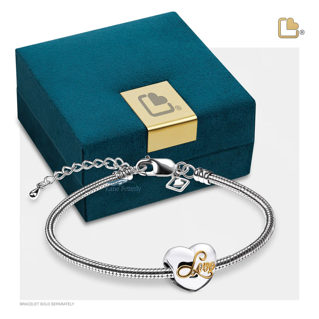 Breloque pour cendres en forme de coeur ornée du mot «Love» plaqué or. Fabriqué à la main en argent sterling .925 plaqué de rhodium.