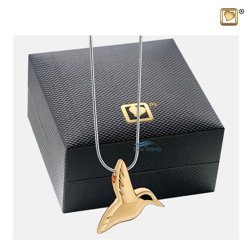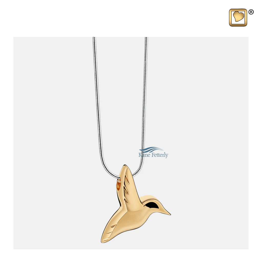 Pendentif pour cendres en forme de colibri, finition en or vermeil poli. Fabriqué à la main en argent sterling .925 plaqué de rhodium.