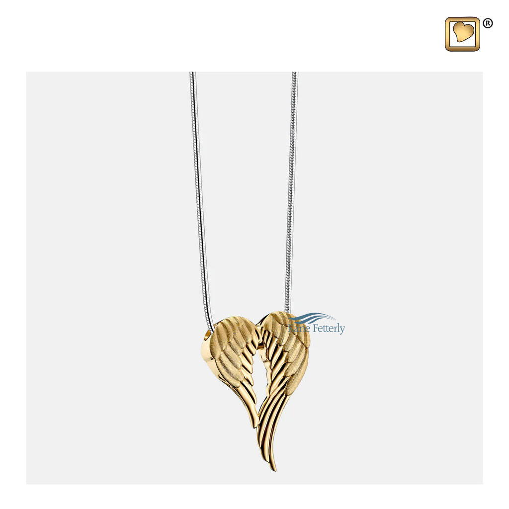 Pendentif pour cendres en forme d’ailes d’ange, finition en or vermeil poli et brassé. Fabriqué à la main en argent sterling .925 plaqué de rhodium.