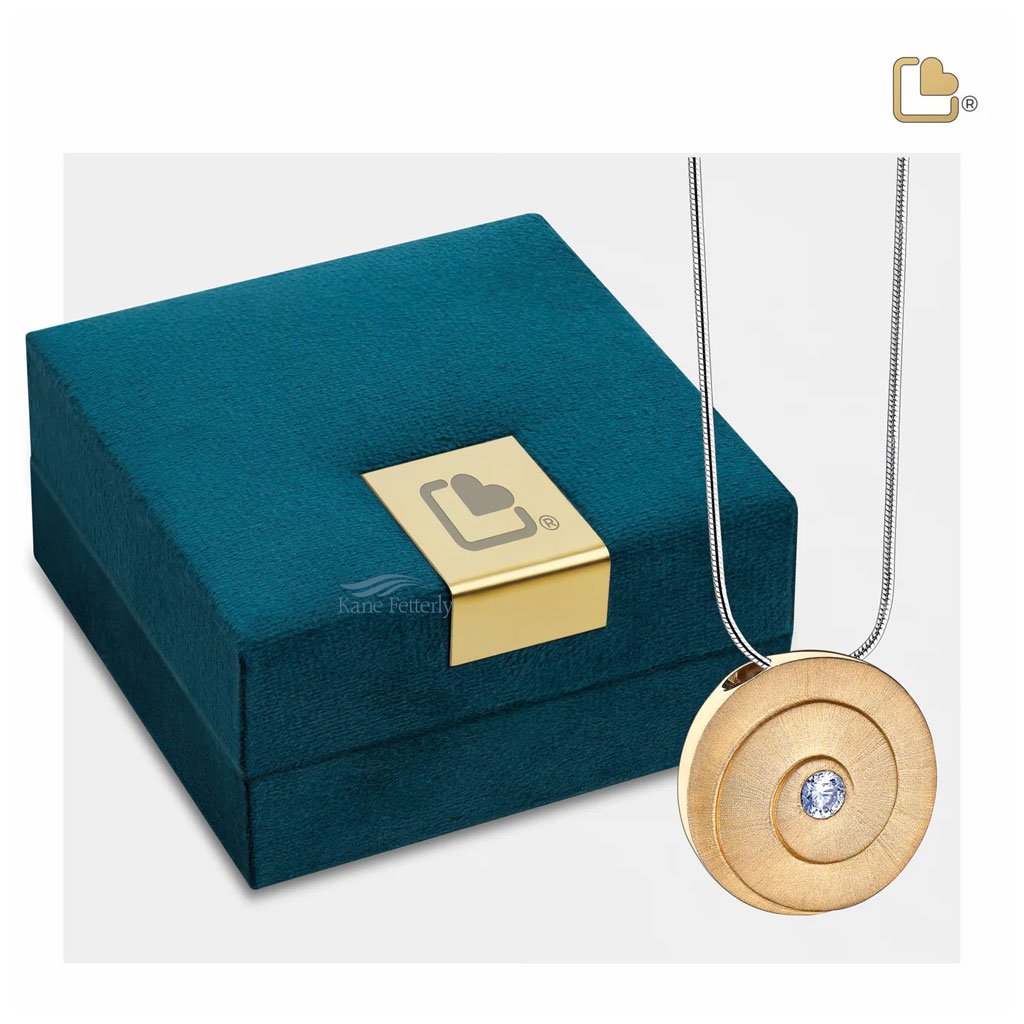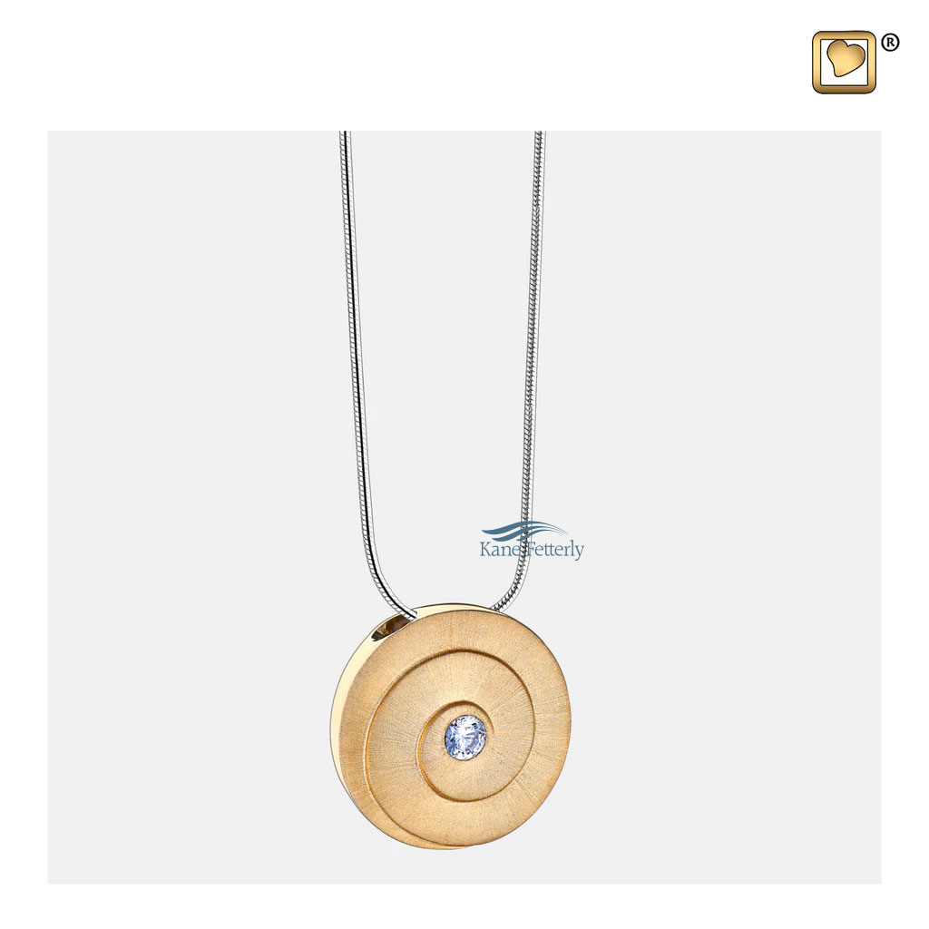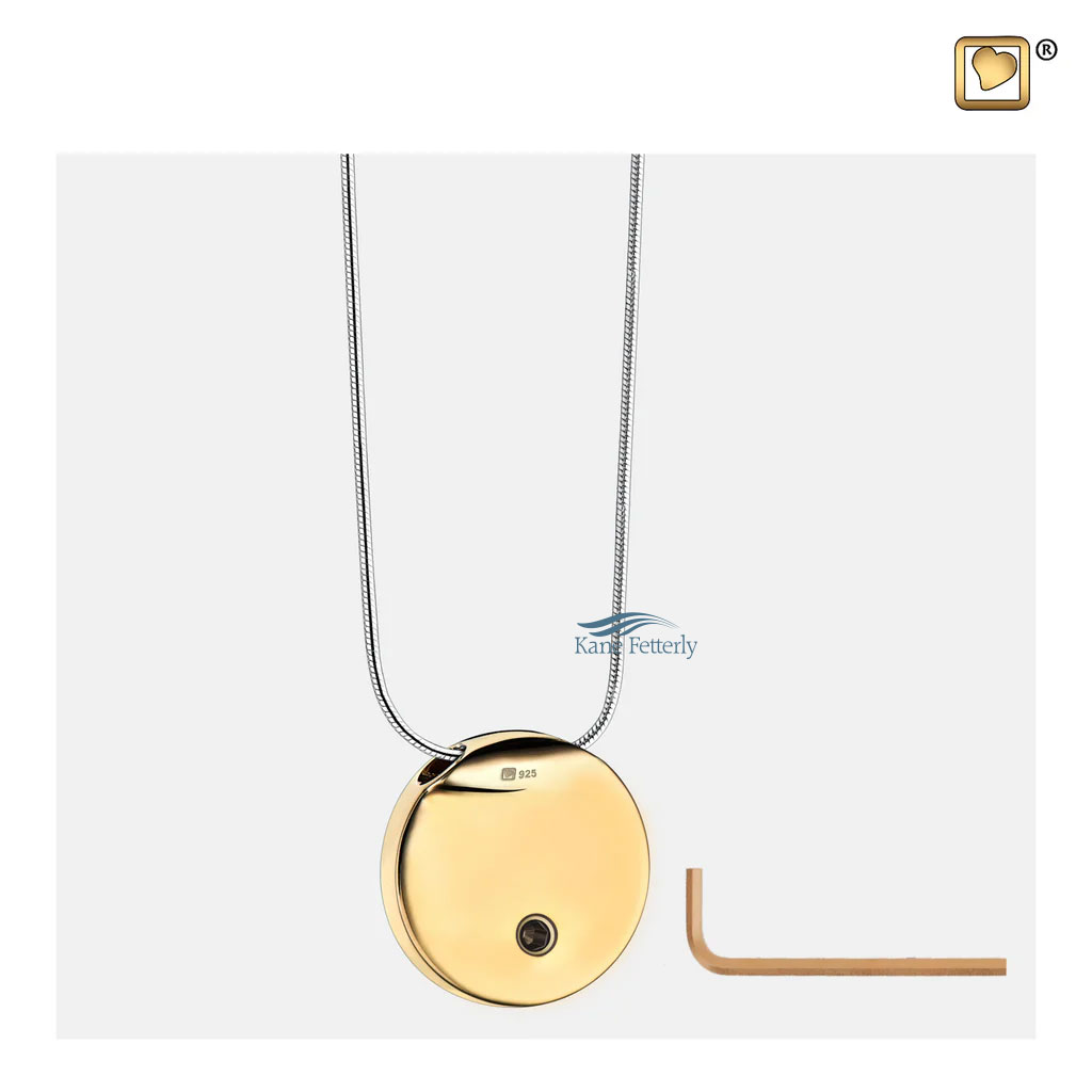 Pendentif pour cendres rond avec zirconia, finition en or vermeil brossé. Fabriqué à la main en argent sterling .925 plaqué de rhodium.