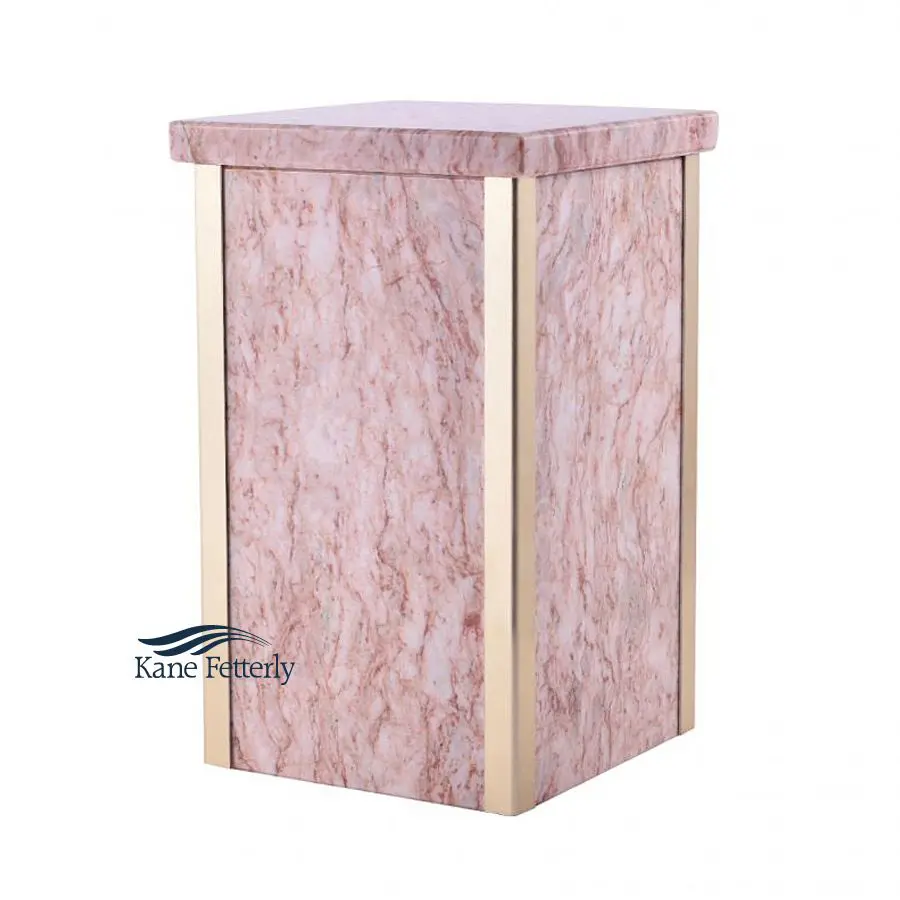 Urne en marbre naturel rose ornée de bordures dorées.