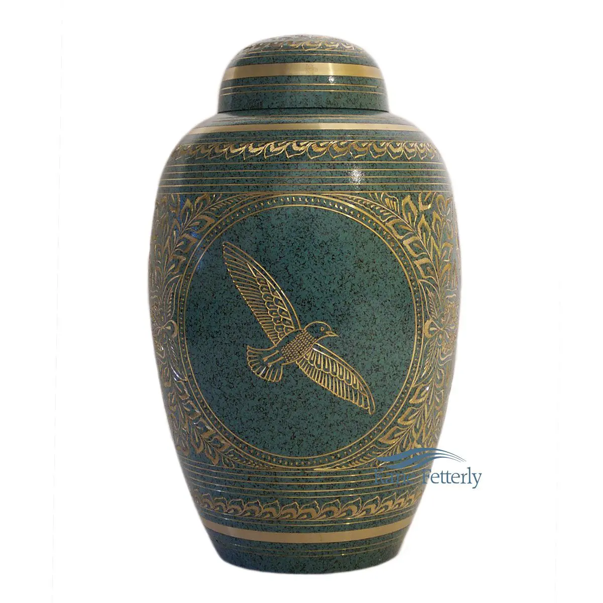 Urne en laiton vert patiné avec oiseau en vol et des motifs floraux gravés en or.
