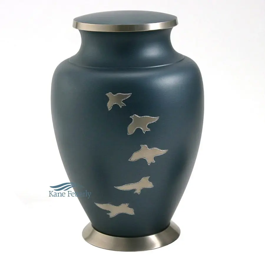 Urne en laiton avec une finition matte bleue, ornée de colombes et d’accents sur la base et le couvercle en étain brossé.