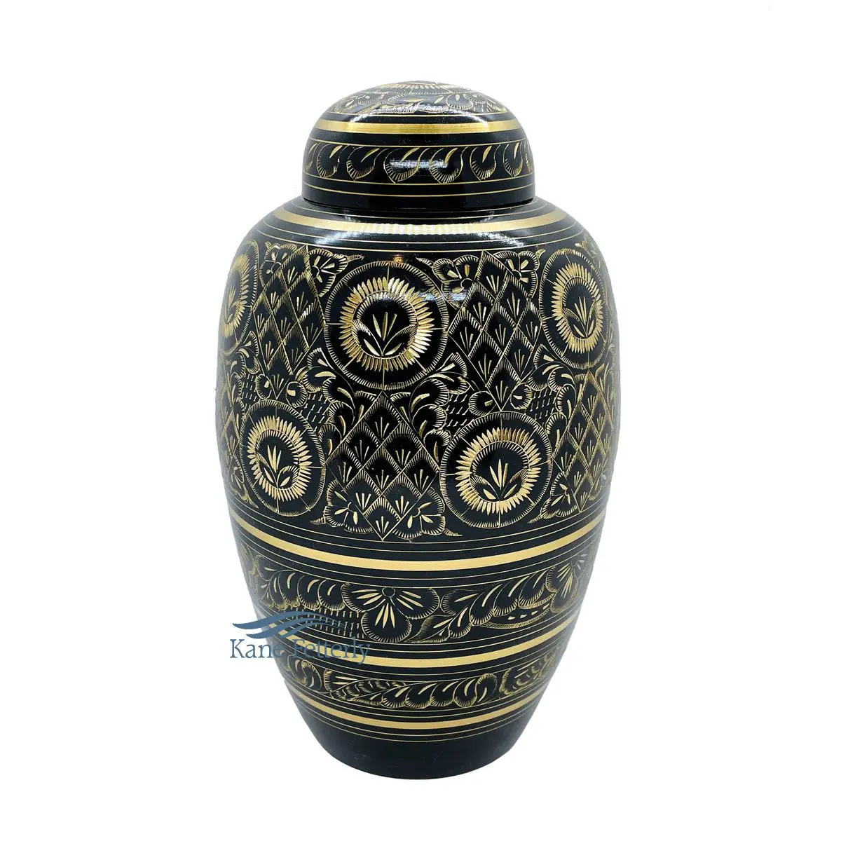 Urne en laiton de couleur noire avec motifs floraux dorés.