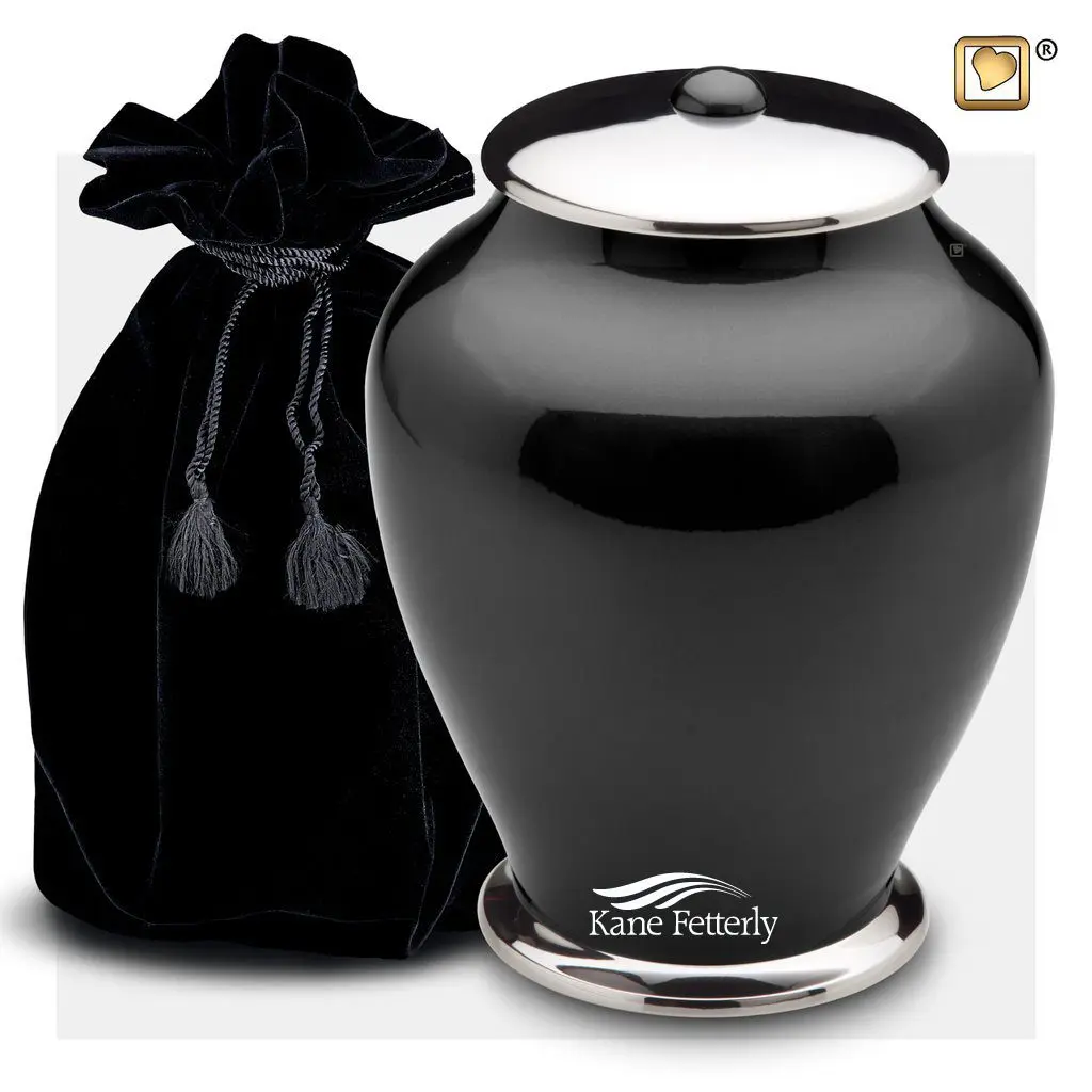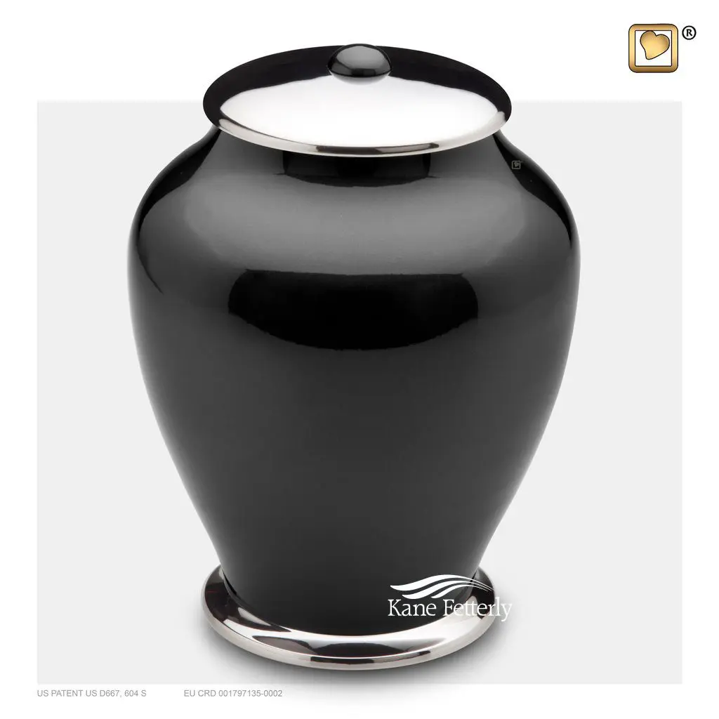 Urne en laiton et alliage de métal avec une finition perlée gris-bleu foncée et des accents en argent poli.