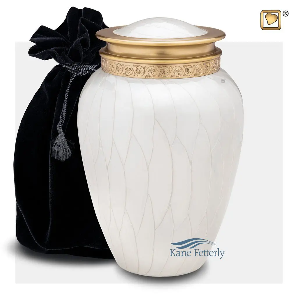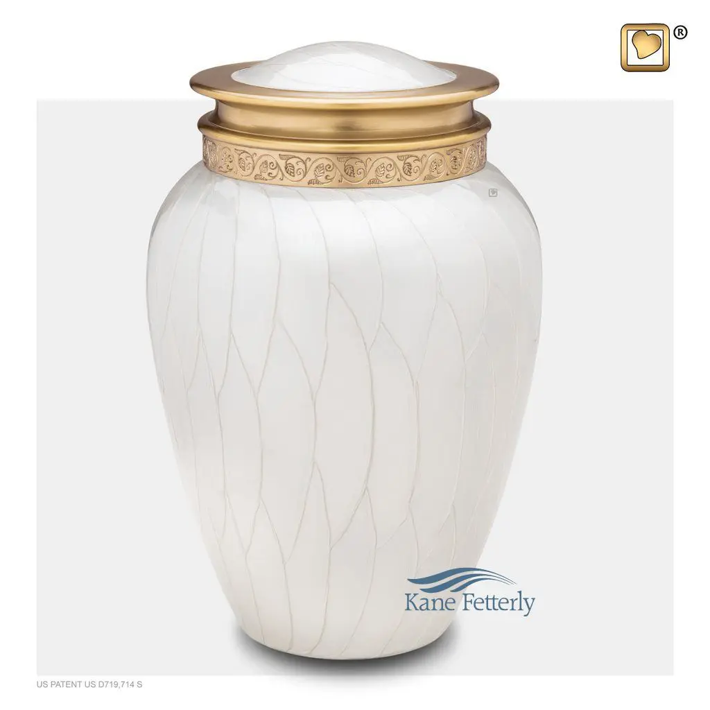 Urne en laiton et en alliage avec une finition perlée blanche brillante, accentuée par de l’or brossé et un bandeau orné d’un motif de feuilles délicat.