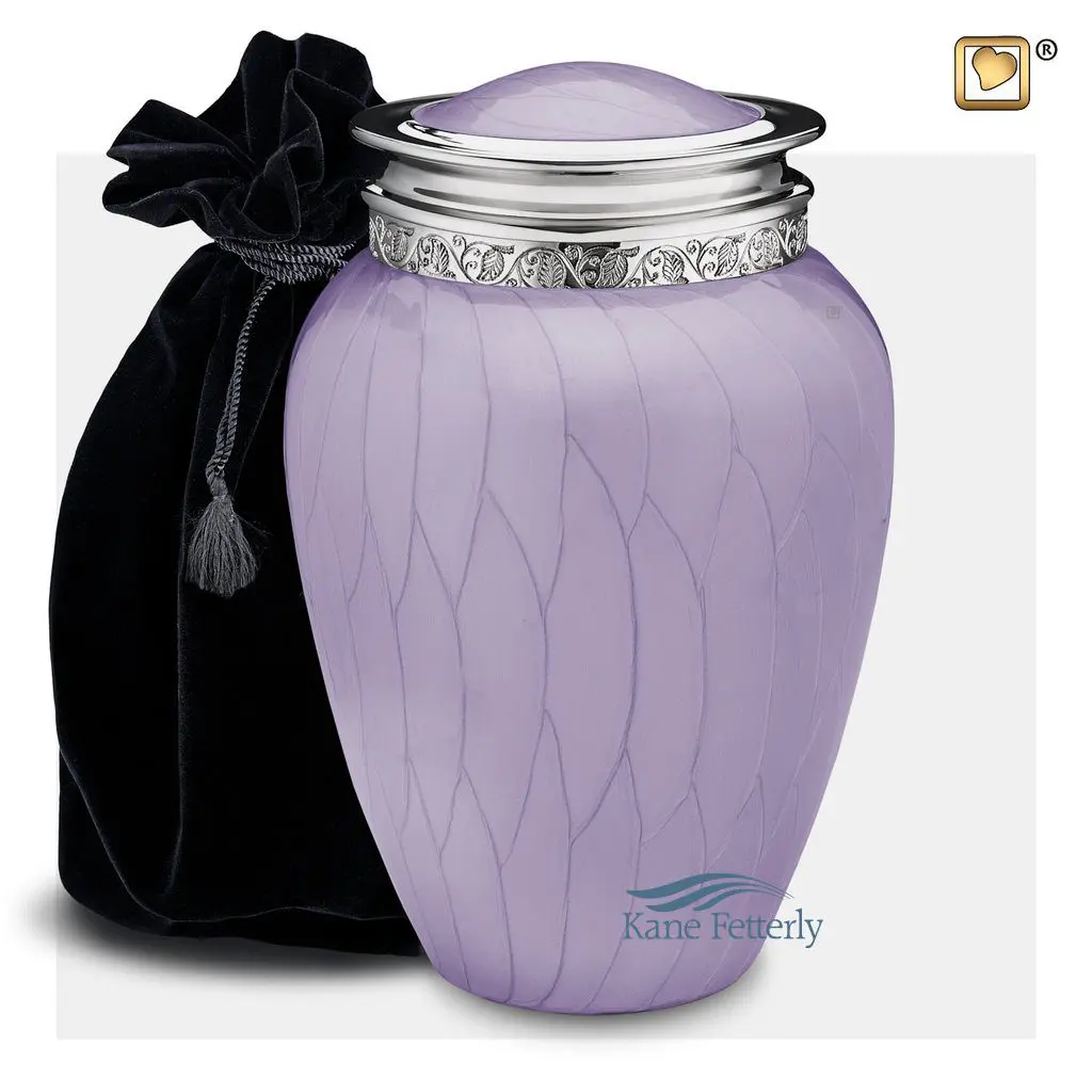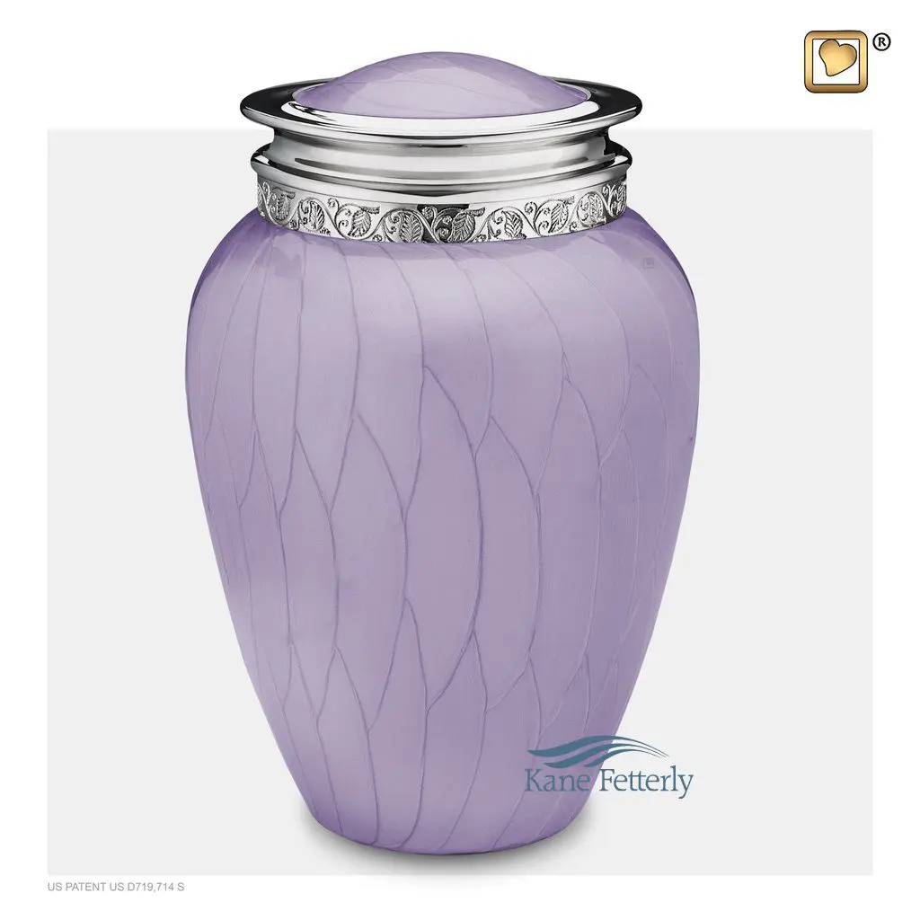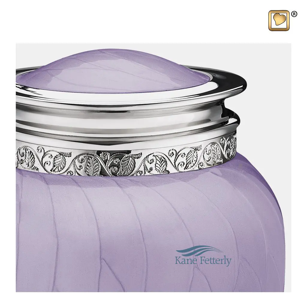 Urne en laiton et en alliage avec une finition perlée lavande brillante, accentuée par de l’argent poli et un bandeau orné d’un motif de feuilles délicat.