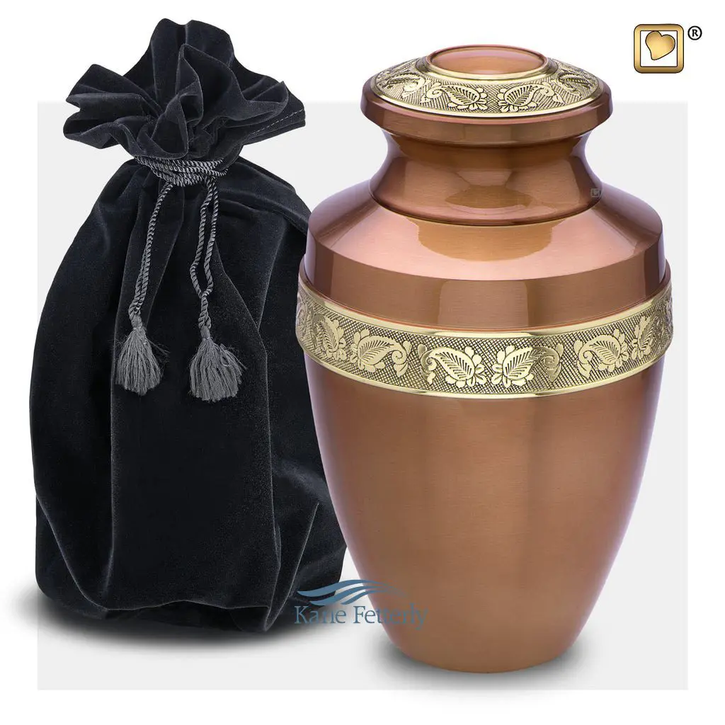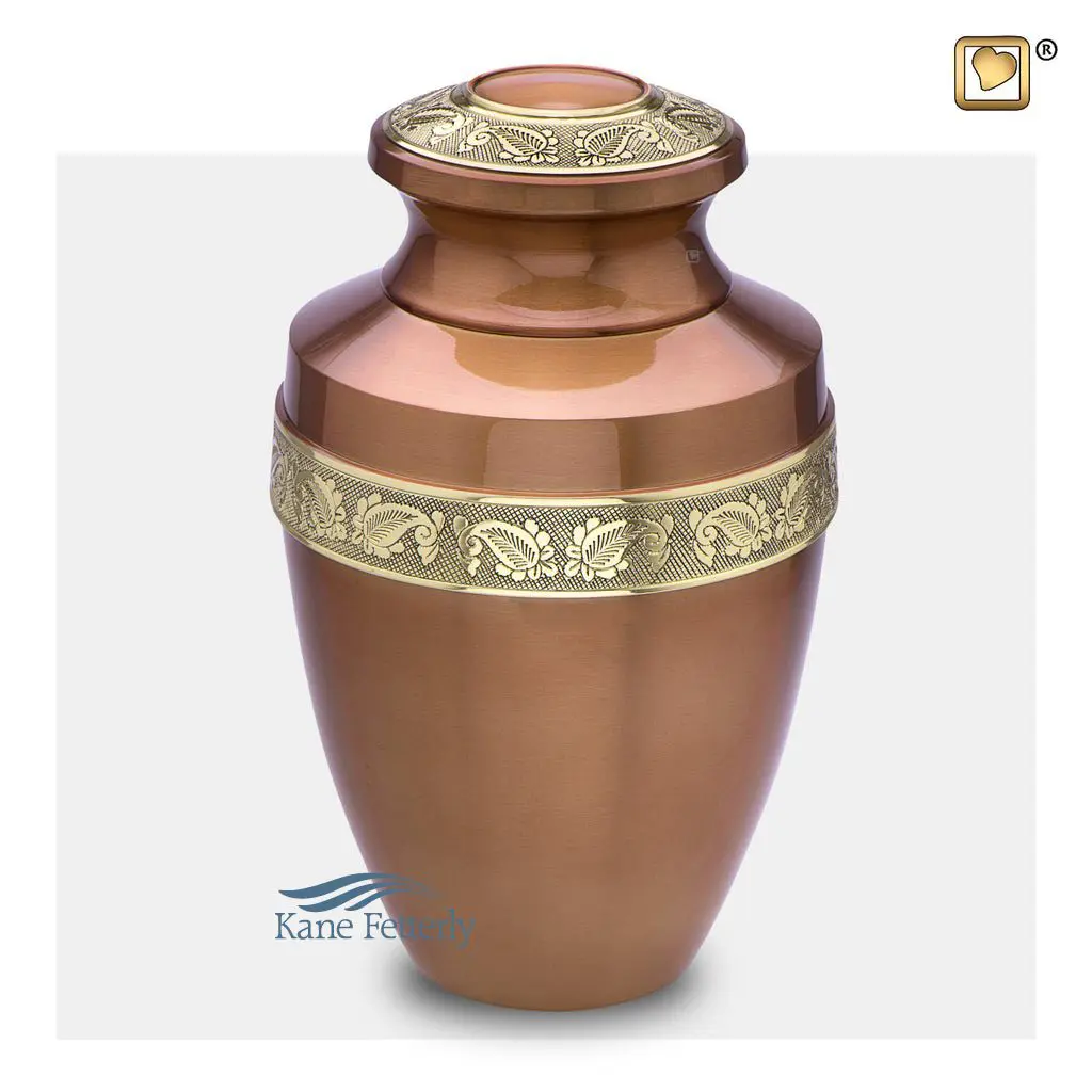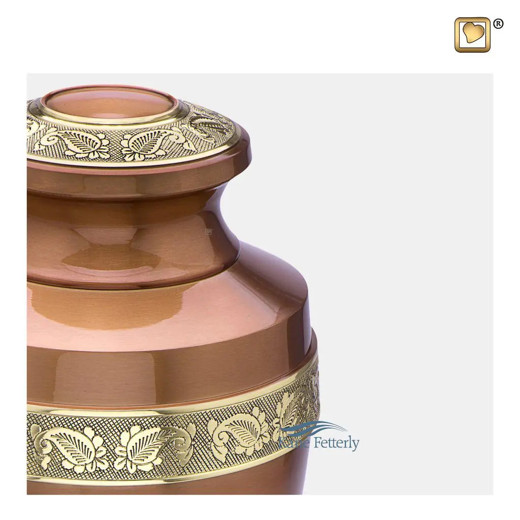 Urne en laiton avec une finition brillante en cuivre décorée d’une bande dorée à motif de foliage et d’accents en or brossé.
