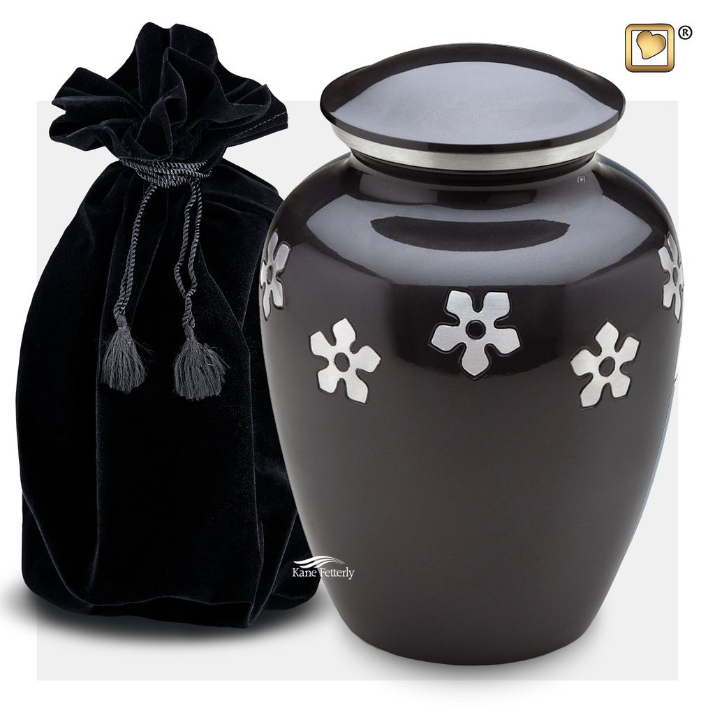 Urne en alliage de métal à motif de fleurs avec une finition bleue-gris foncé brillante et des accents en étain brossé.