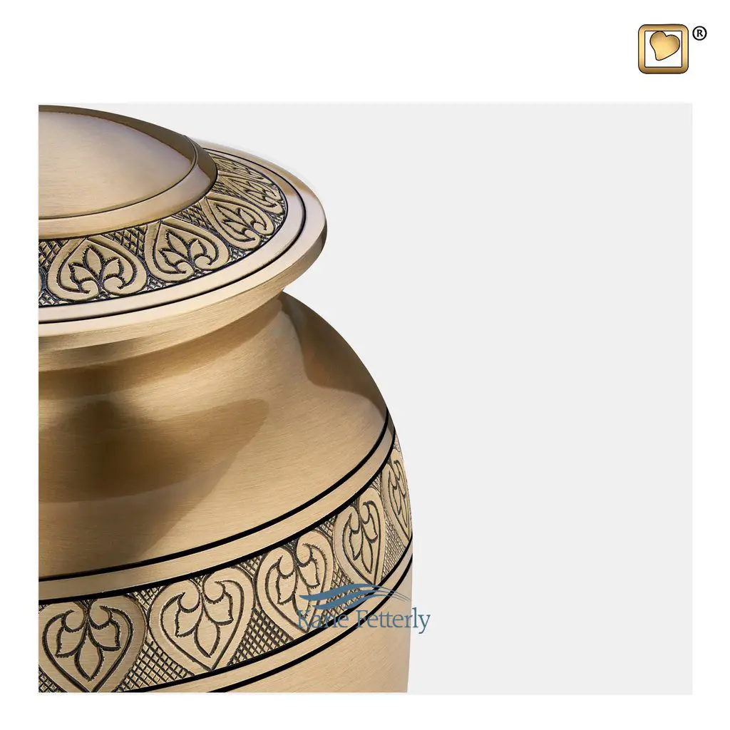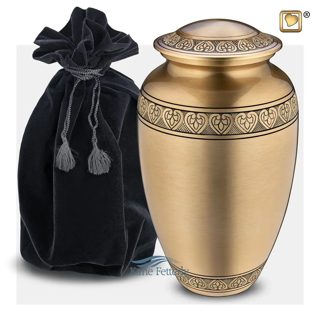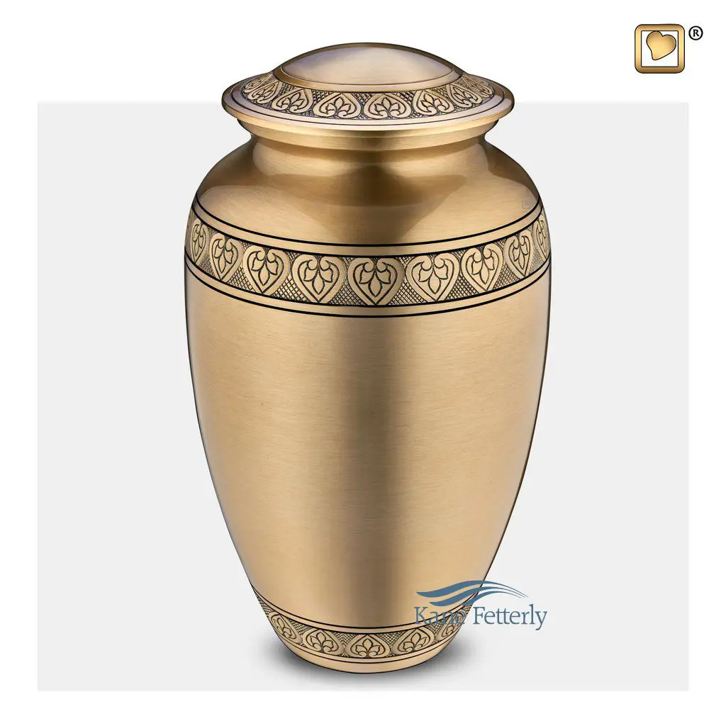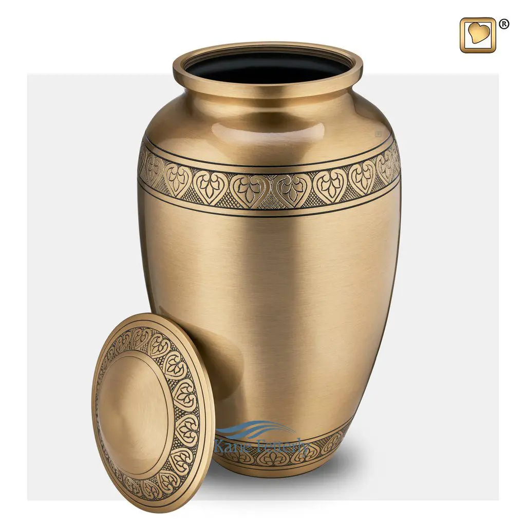 Urne en laiton doré ornée de bandes à motif de coeurs autour de la base et du dessus.