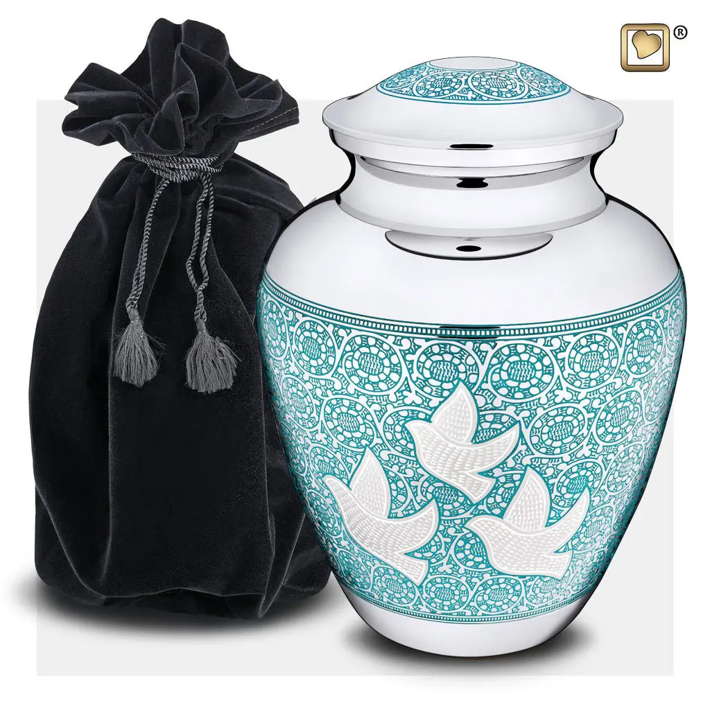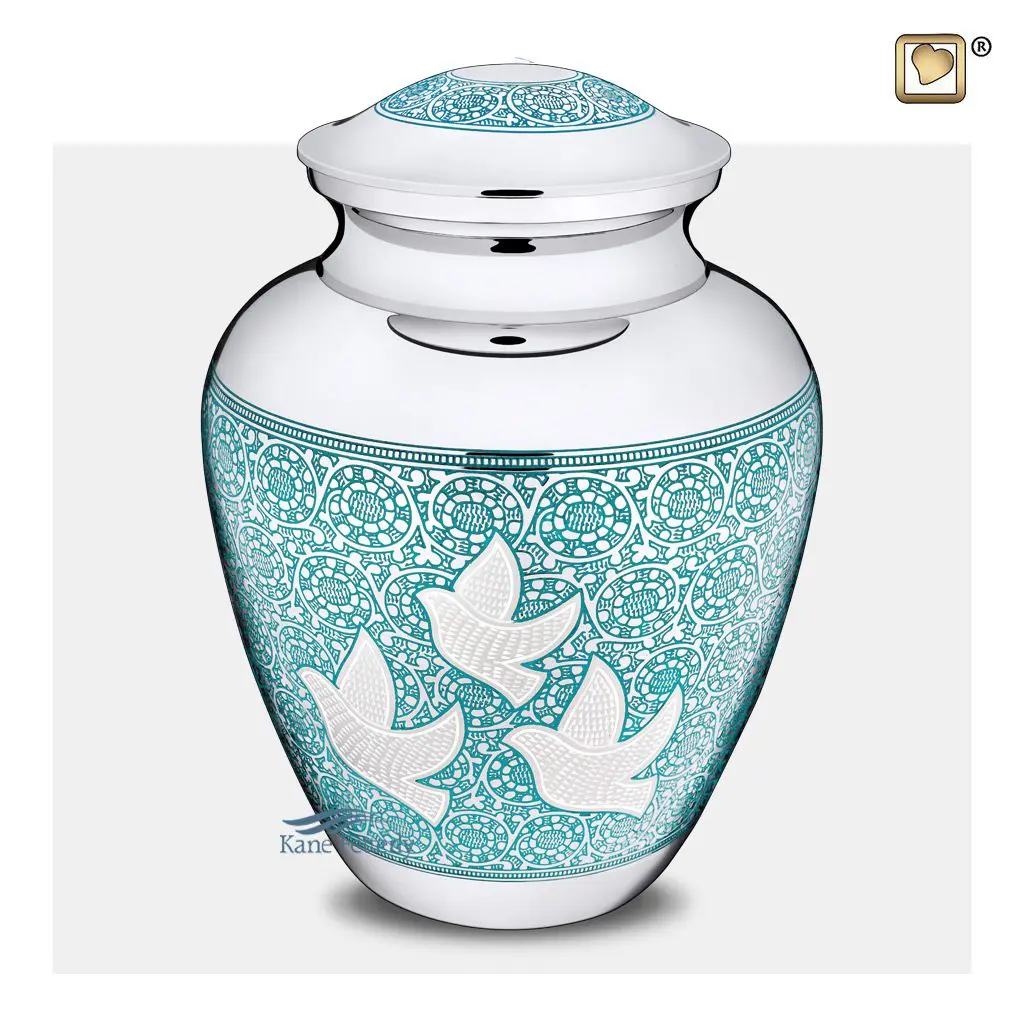 Urne en laiton ornée des colombes en vol. Accents en argent poli et motifs gravés en argent et bleu.