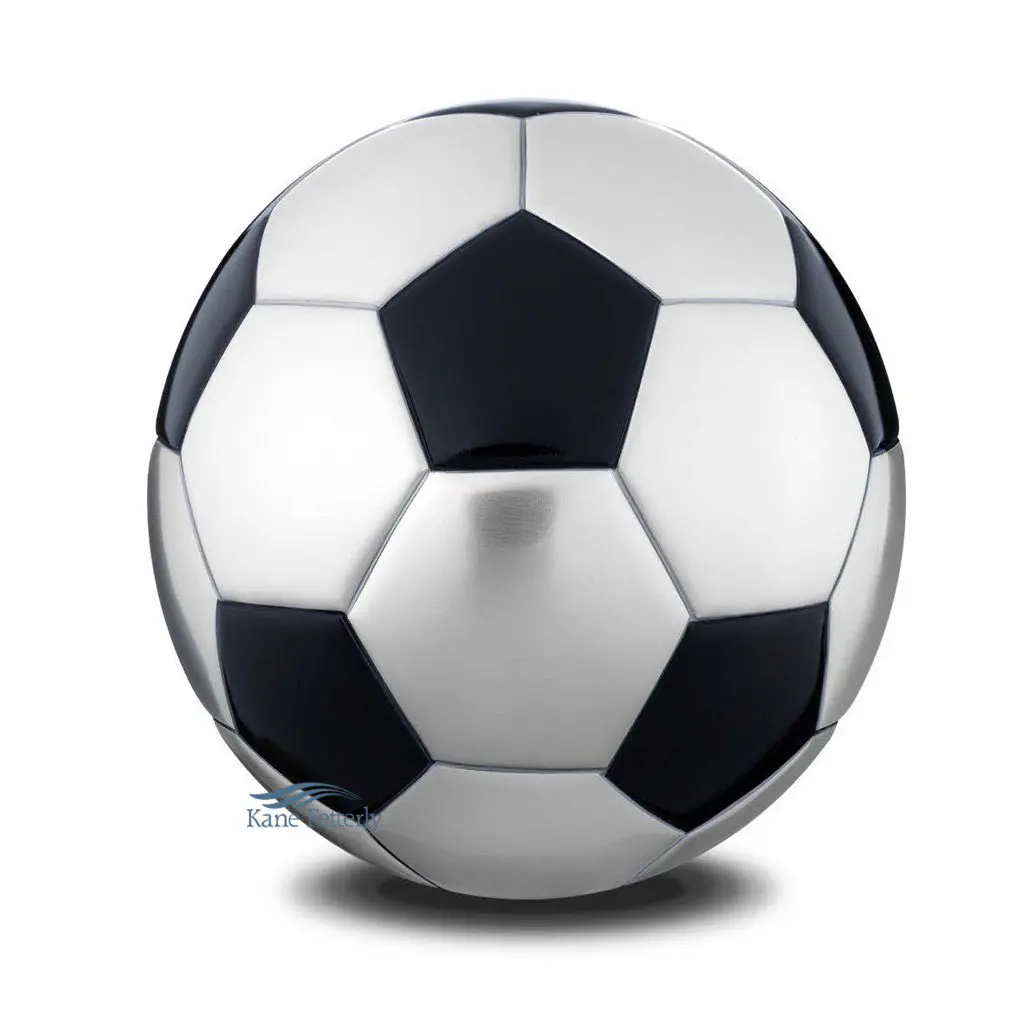 Urne en laiton en forme de ballon de soccer, finition en étain brossé et noir.
