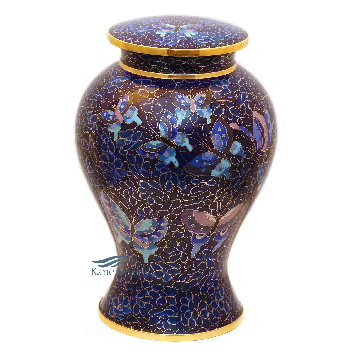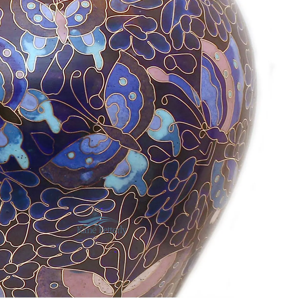 Urne en métal cloisonné à motif de papillons sur fond en émail noir et bleu. Bandes dorées autour du couvercle et de la base. Aussi disponible en version urne miniature et urne miniature en forme de coeur.