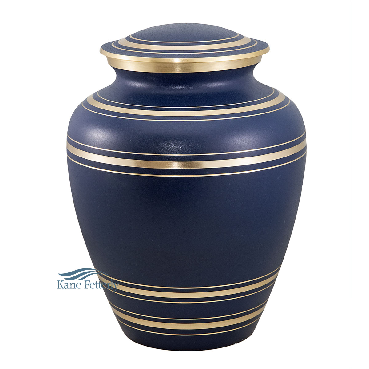 Urne en laiton d’un bleu profond, élégamment rehaussée de bandes dorées entourant la base, le corps et le couvercle.