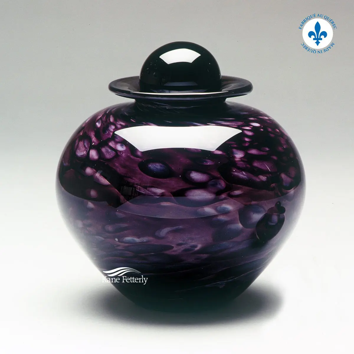 Urne cinéraire en verre soufflé de couleur violet foncé fabriquée à la main par artiste verrier.