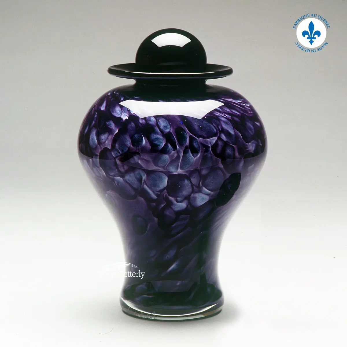 Urne cinéraire en verre soufflé de couleur violet foncé fabriquée à la main par artiste verrier.