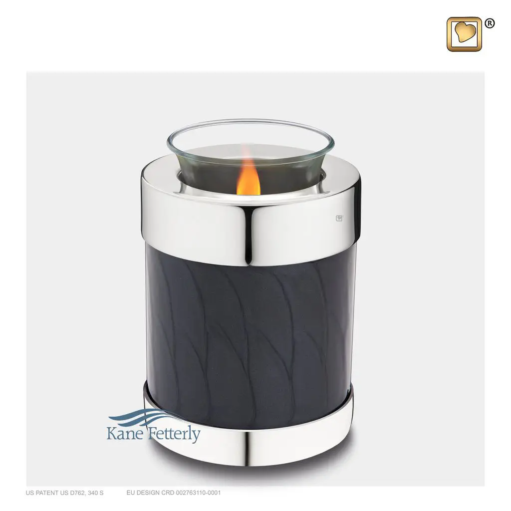 Urne miniature en forme de bougeoir en laiton et en alliage avec une finition perlée gris-bleu brillante, accentuée par de l’argent poli. Le bougeoir possède un compartiment conçu pour contenir des cendres.