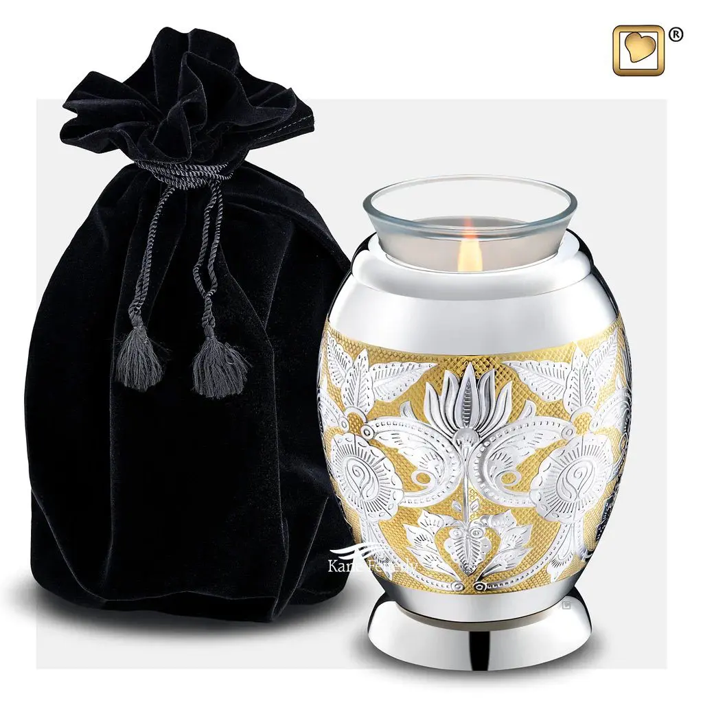 Urne miniature en laiton en forme de bougeoir décorée de motifs floraux argentés sur un fond doré, accents en argent poli.