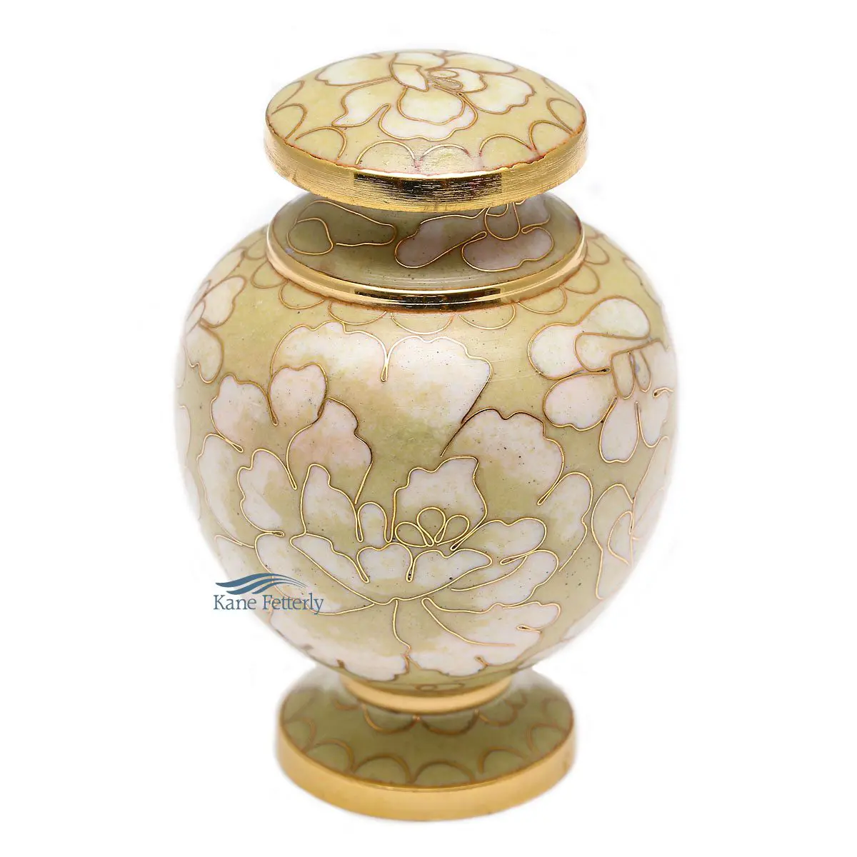 Urne miniature en métal cloisonné à motif floral, finition émaillée beige. Bandes dorées autour du couvercle et de la base.