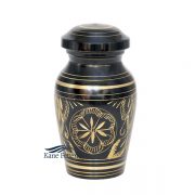 Urne miniature en laiton de couleur noire ornée de motifs floraux gravés en or.