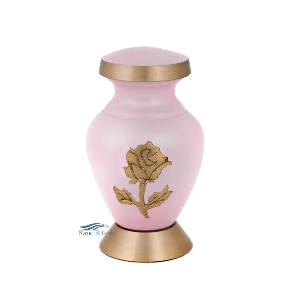 Urne miniature en laiton de couleur rose ornée d’une rose dorée.