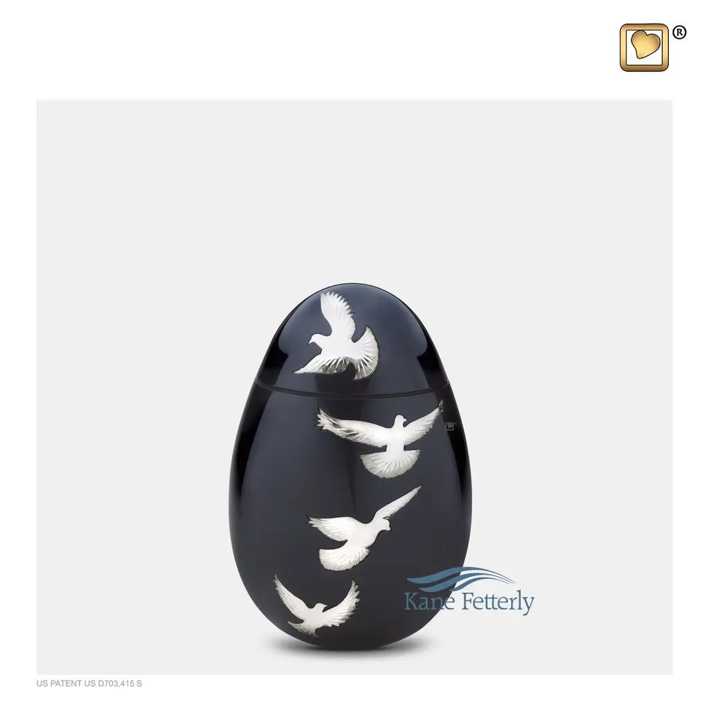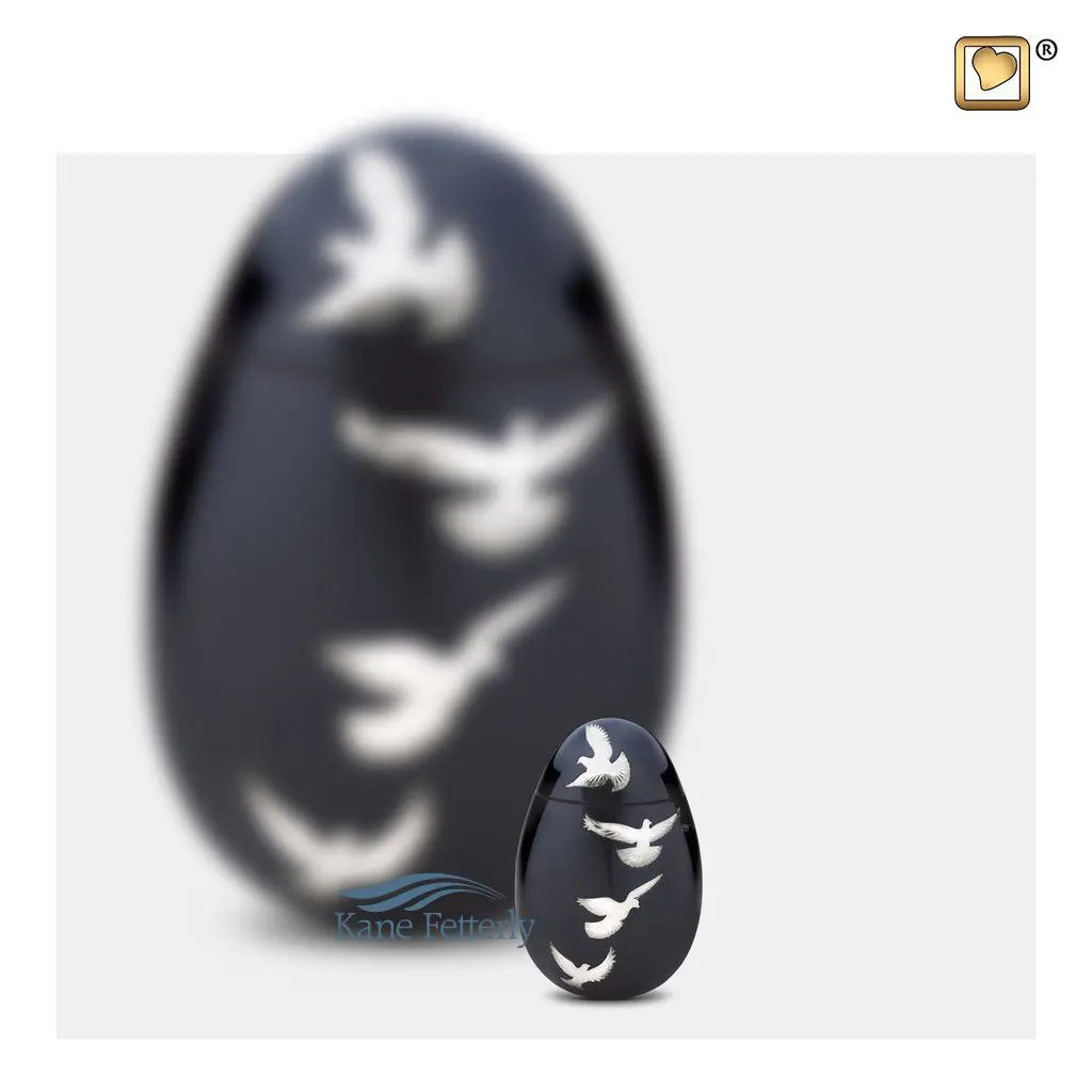 Urne miniature ovale en laiton à motif de colombes en vol avec une finition gris-bleu foncée et en argent poli.