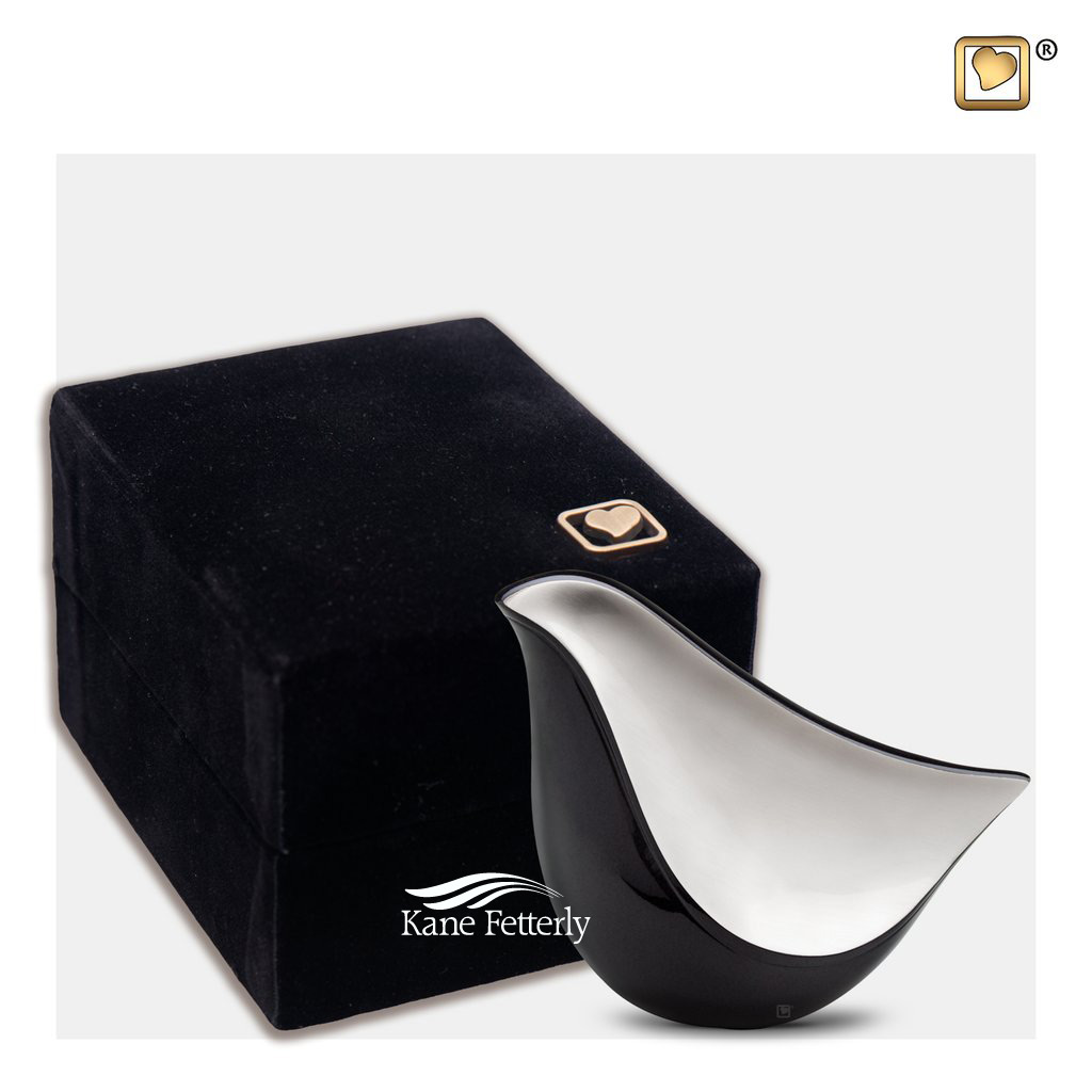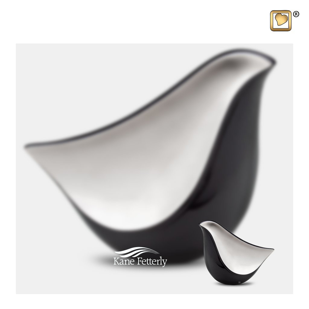 Urne miniature en forme d’oiseau en laiton gris anthracite, accents argentés brossés.